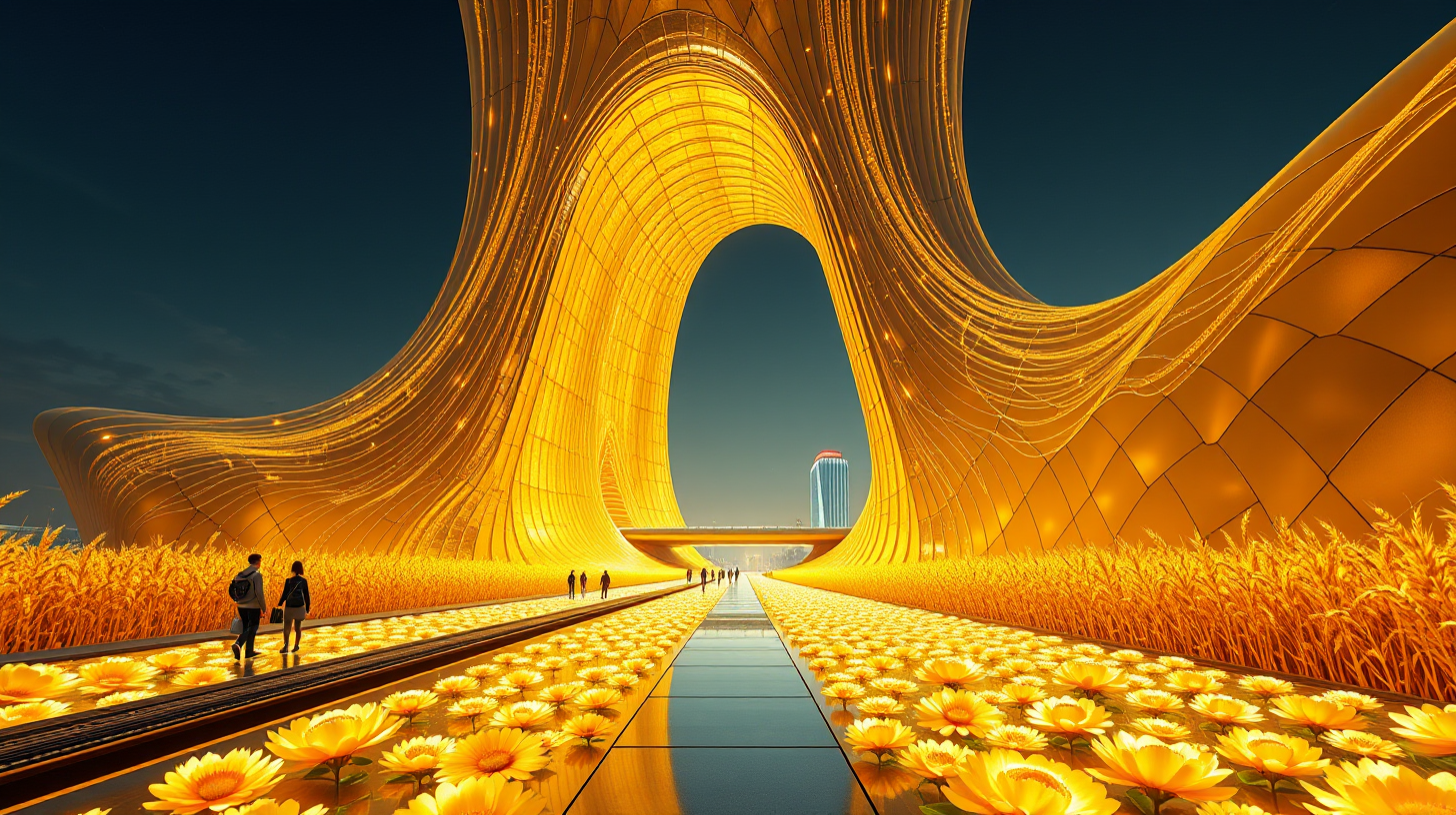 描述:郑州东站枢纽塔突然展开可变形拓扑结构,建筑表面瞬间涌现金黄的量子麦浪,这是农业AI在模拟中原粮仓的丰收景象。金色的麦浪随风起伏,仿佛将整个车站变成了一片金色的海洋。通勤者行走在磁悬浮意识流走廊时,脚下会绽放出绚丽的牡丹光纹,每一步都像是在编织一幅流动的画卷,现代交通枢纽与传统农耕文明在此刻完美交融。