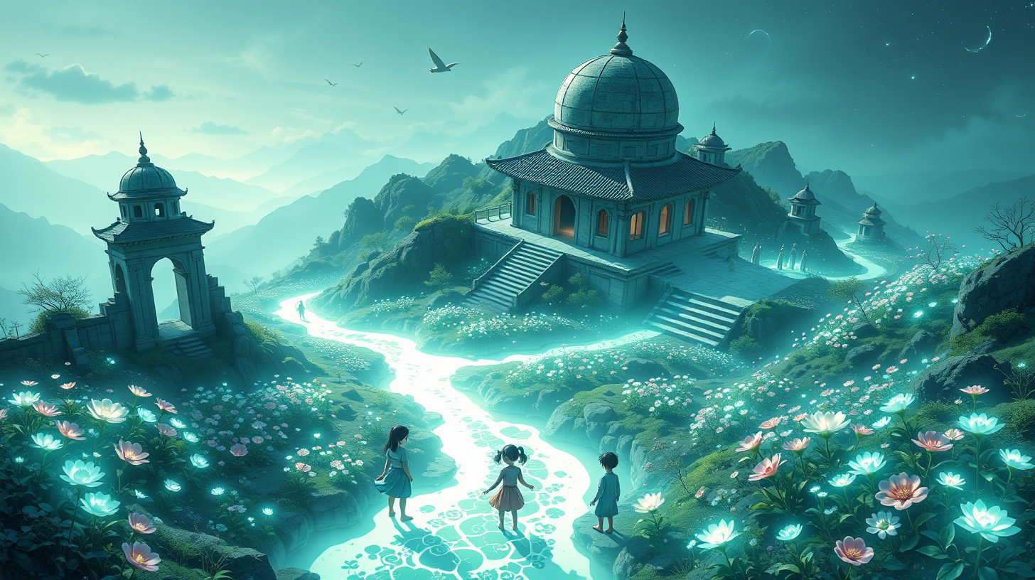 作图提示词:An ethereal high-angle view of Dengfeng Observatory ruins bathed in soft bioluminescent glow, where a shimmering river of dark matter-converted light flows through the ancient structure. In the foreground, children interact with a neural garden where their thoughts make Oracle Bone Script flowers bloom in fractal patterns. The background shows retired engineers performing Shaolin-inspired gravitational ballet that programs the city’s defense grid. The composition uses rule of thirds with the light river as leading lines, while atmospheric perspective creates depth. The color scheme features pearlescent whites, deep cerulean blues, and viridescent greens with subtle chromatic aberration effects. Soft diffused lighting creates a dreamlike quality, with the observatory ruins sharply detailed against the glowing landscape.