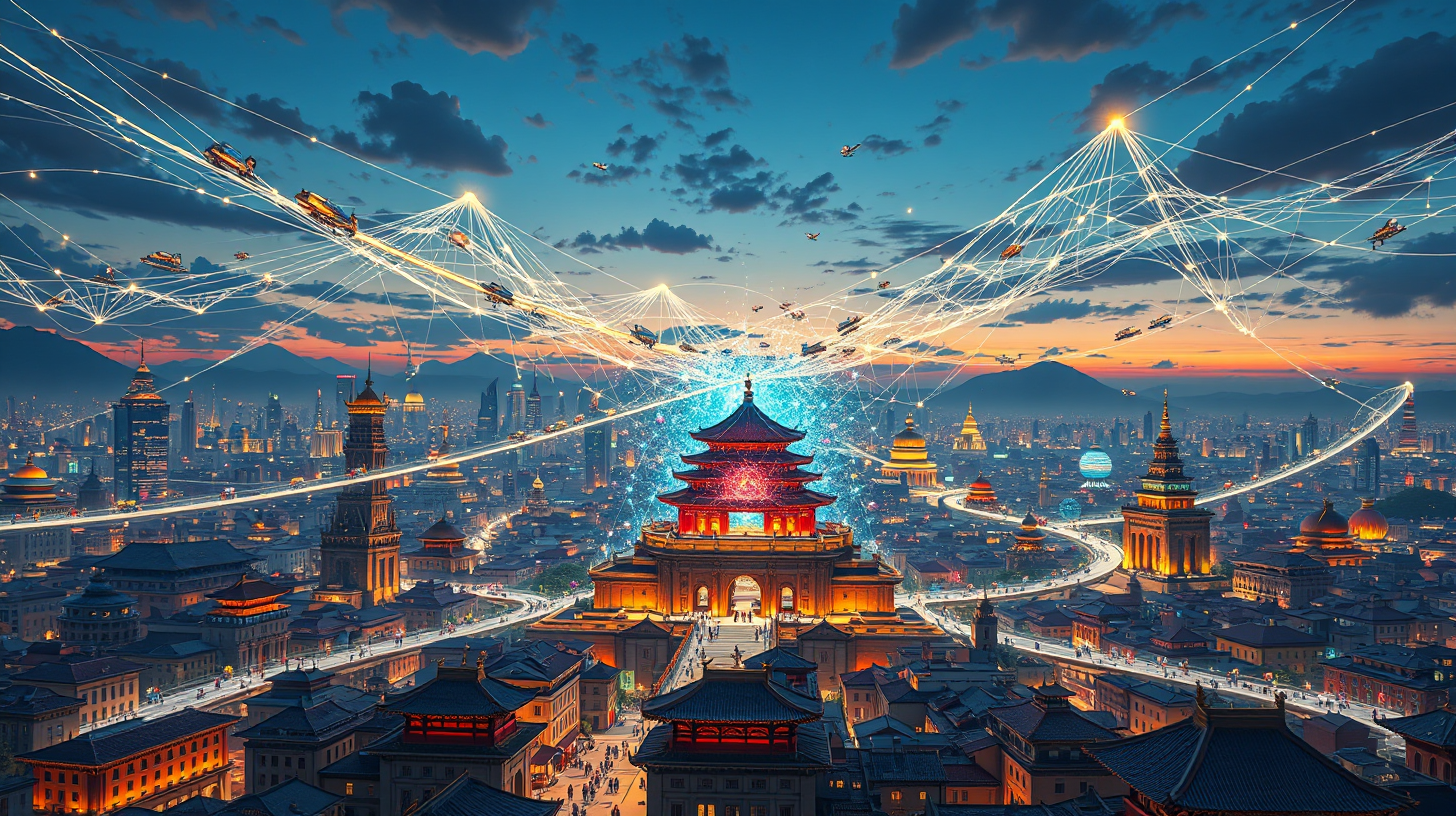 作图提示词:anime surrealistic fantasy, A magnificent cityscape at twilight, with a three-dimensional Silk Road network woven from photonic threads spanning the sky. Holographic merchant caravans from various historical periods traverse the luminous pathways alongside futuristic quantum logistics vehicles. At the center, a cultural artifact dissolves into glowing particles that reform into an interactive heritage visualization interface. The composition uses warm architectural tones contrasting with cool photonic glows, with a deep depth of field showing both ground-level details and aerial network.