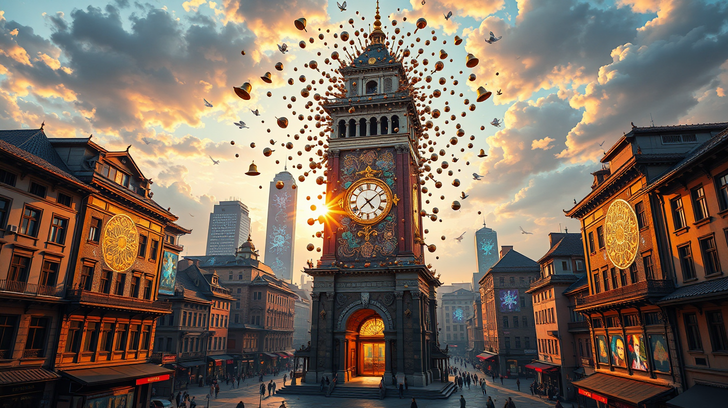 作图提示词:anime surrealistic fantasy, A dramatic city center transformation as the historic bell tower undergoes molecular reorganization into a brainwave resonance device. Millions of bronze components hover in precise formation, catching the late afternoon light. The device responds to cultural stimuli, projecting intricate animated patterns from various dynasties across all building facades. The composition uses dynamic lighting with warm metallic tones contrasting against vibrant holographic projections, creating a sense of technological wonder rooted in cultural heritage.