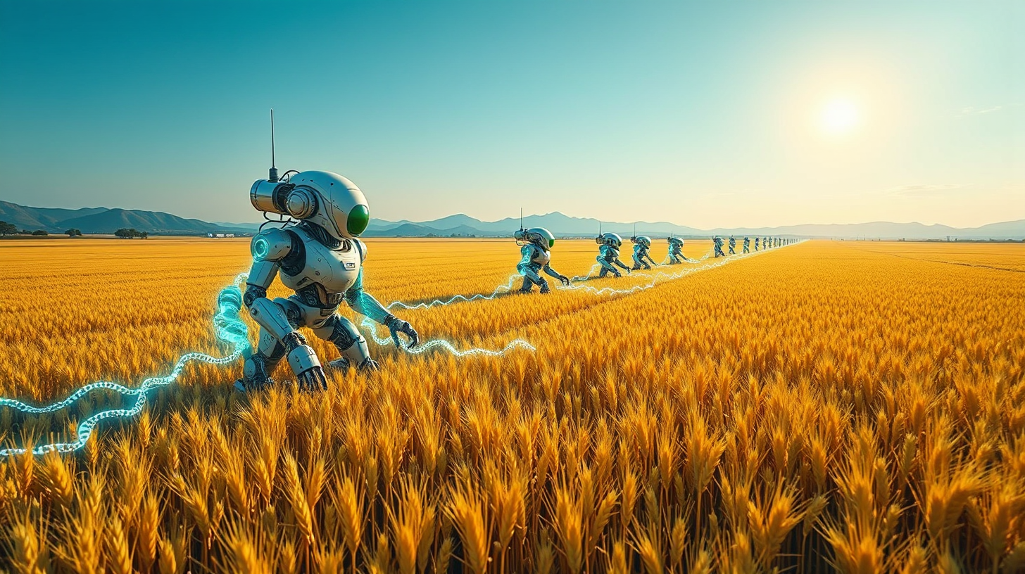 描述:咸阳郊外的智慧农田里,搭载后稷算法的种植机甲排列成阵,机械臂播撒杂交小麦种子时,量子计算单元迸射蓝光,在空中编织出双螺旋光链。光链一端连接着土壤中的数据传感器,另一端投射出后稷教民稼穑的全息影像,金黄麦浪与蓝色光链在风中共振。田埂如电路板般规整,灌溉节点的水珠折射出农书典籍的文字,科技让千年农耕智慧在稻穗间重生。