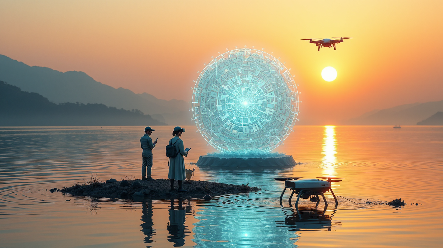 作图提示词:anime surrealistic fantasy, A serene riverside scene at sunset along the Wei River, where spiral star vortices containing quantum-encoded poetry rise from the water’s surface. Researchers equipped with augmented reality visors collect and interpret the vortices, forming a holographic display of classical poetry that shimmers above the water. An archaeological monitoring drone observes the phenomenon, its sensors pulsing rhythmically. The warm golden hour lighting creates beautiful reflections on the water, with the composition balancing the technological elements with natural beauty.