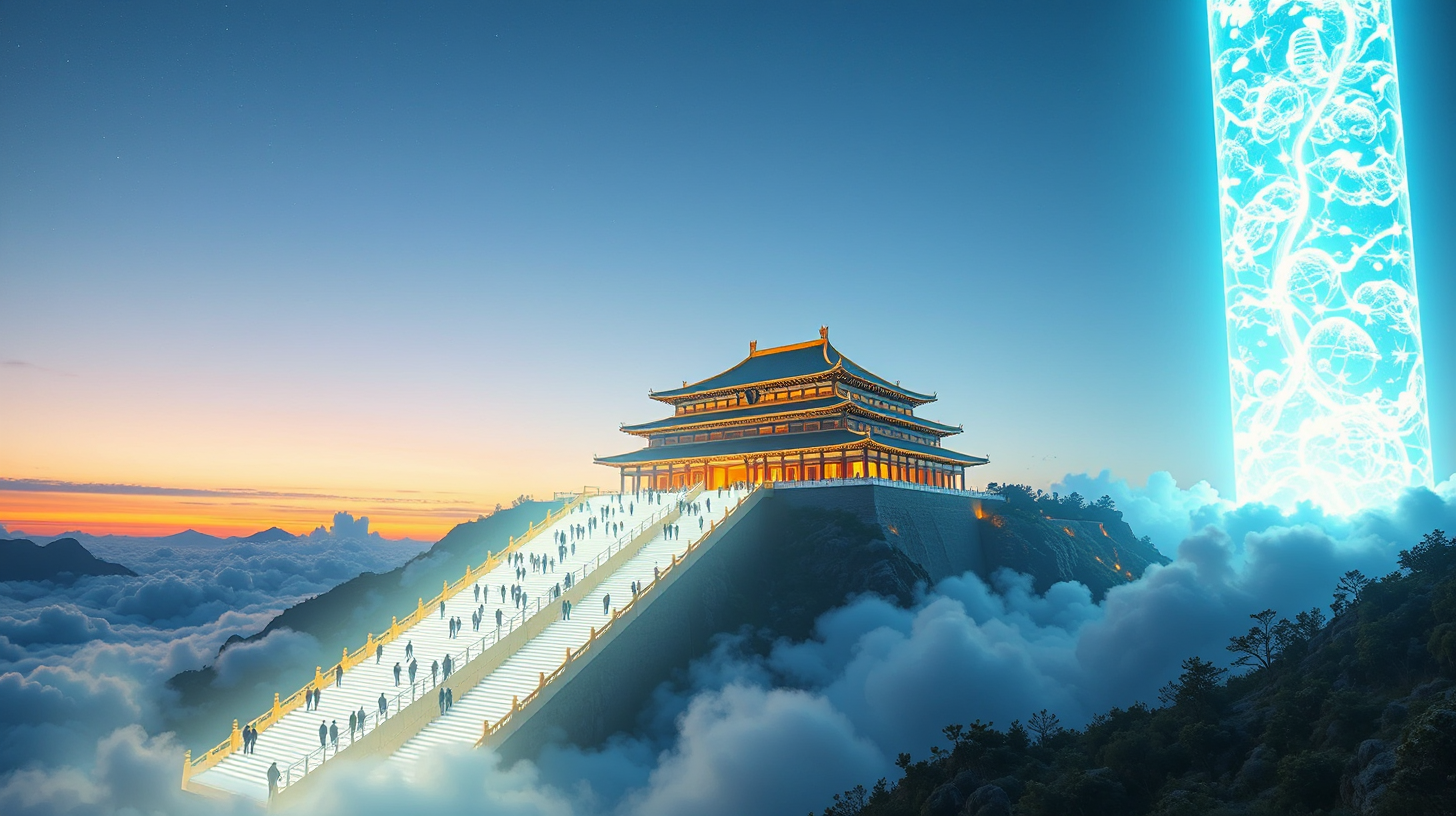 作图提示词:anime surrealistic fantasy, A breathtaking reconstruction of Xianyang Palace suspended in the clouds above Shaanxi, formed by luminous energy streams that crystallize into celestial staircases. The palace gates unveil holographic figures of ancient and modern builders uniting, igniting a towering pillar of civilization light spanning millennia. Shot from a dramatic low-angle perspective, the composition emphasizes the monumental scale of the glowing staircase and palace against a twilight sky. The lighting contrasts the palace’s golden radiance with the pillar’s intense white-blue glow, using chiaroscuro techniques for depth. The transcendent mood captures the perfect fusion of past and future through cinematic grandeur and symbolic architectural details.