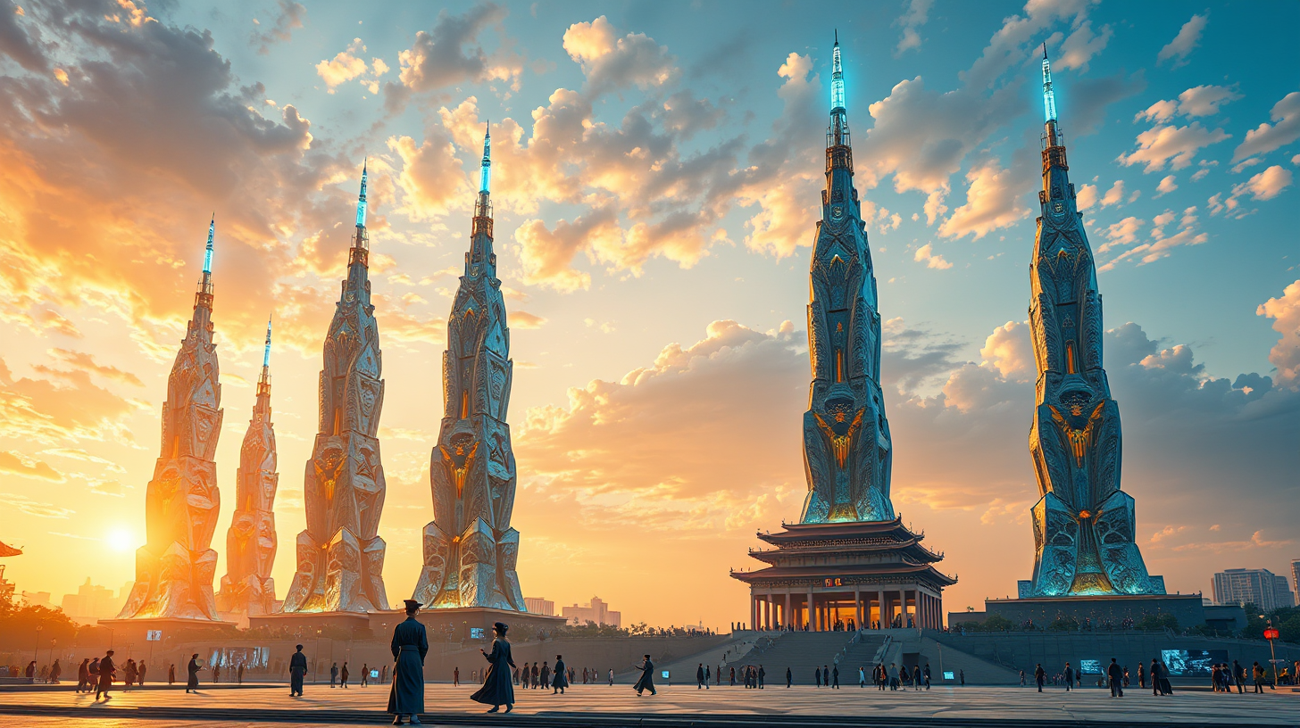 作图提示词:Seven neuro-pulse towers of crystalline graphene along Beijing’s central axis at golden hour, their fractal structures channeling photonic data rivers contained by quantum fields, hanfu-clad programmers with AR visors manipulating holographic interfaces at the plaza below, dramatic Dutch-angle composition showing towers piercing the stratocumulus while data streams pulse in sync with AI-generated guqin harmonics, hyper-detailed fusion of Song Dynasty architectural proportions with bioluminescent tech, color gradient from molten gold at base to ethereal blue at spires, volumetric lighting from tower-created plasma formations