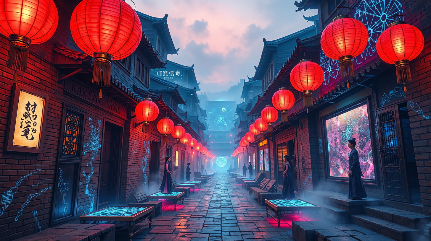 作图提示词:A futuristic Beijing hutong at dawn, ancient brick walls embedded with self-sustaining quantum circuits projecting dynamic fractal patterns in blue and violet hues, illuminated by floating holographic red lanterns casting warm ambient light on nanotech-reinforced stone alleys, low-angle wide shot capturing residents in smart-hanfu gliding on magnetic levitation platforms through the misty air, cinematic composition balancing traditional siheyuan architecture with glowing tech accents, soft morning light diffusing through atmospheric nanodroplets, color palette merging vermilion lanterns with cool quantum luminescence