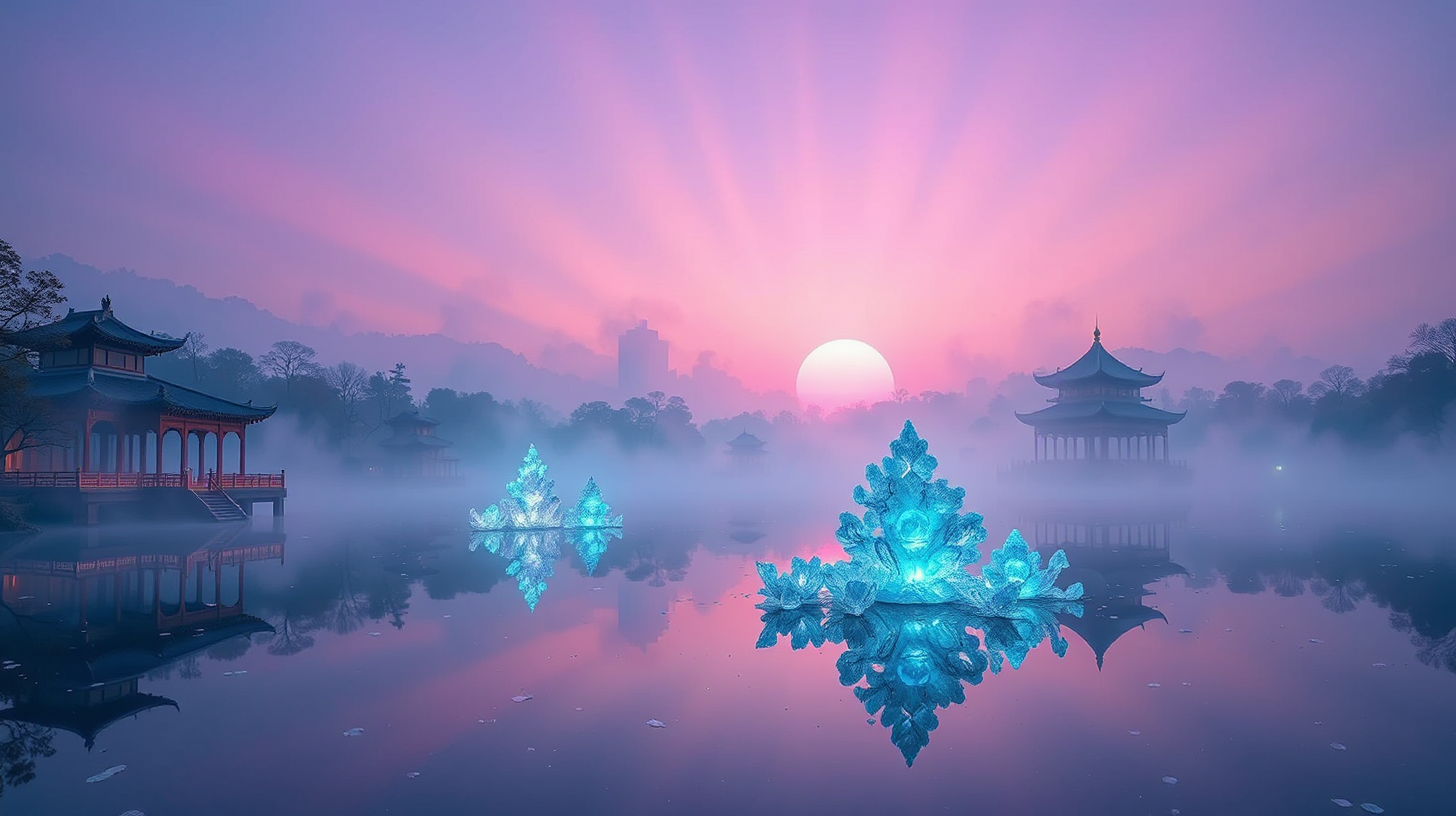作图提示词:Dawn at Beihai Park with intelligent nanotech mist covering the lake surface, translucent memory fragments condensing into intricate crystal sculptures. Traditional Chinese pavilions reflected in the bioluminescent water, illuminated by soft pink and purple sunrise light diffused through the high-tech fog. Horizontal composition shot with a 24-70mm zoom lens at 35mm to capture the transformation process, using a narrow aperture (f/11) for deep focus. Ethereal atmosphere with crepuscular rays penetrating the mist, captured with a medium format camera to show ultra HD details of the crystalline structures forming. Color graded with a cool cyan/orange split tone for futuristic ambiance.