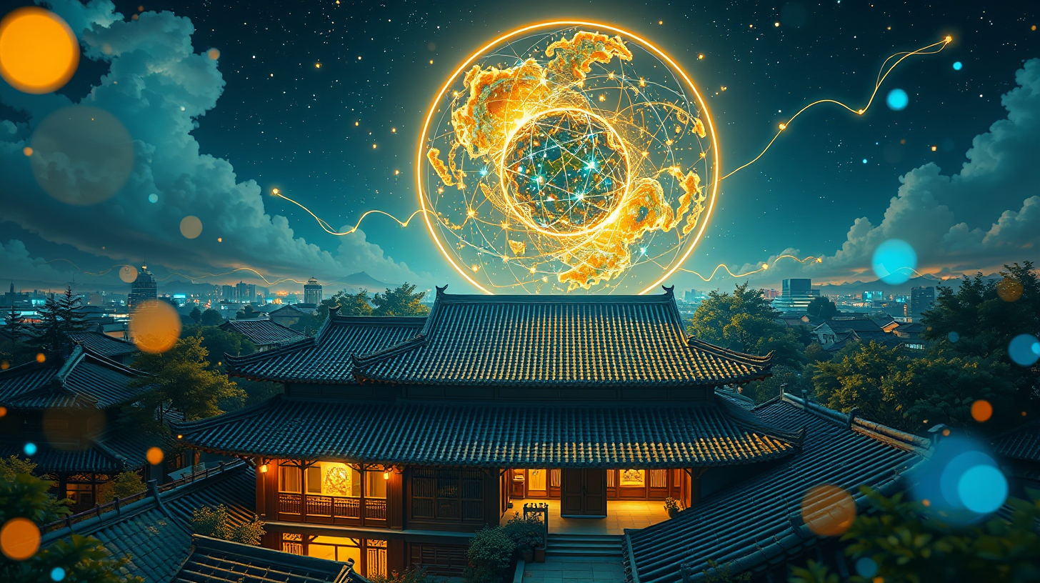 作图提示词:A futuristic Beijing courtyard house at night, featuring a circular holographic light screen unfolding in the sky, glowing augmented reality brush strokes dynamically painting an interactive galaxy map in the air. Traditional Chinese architecture seamlessly integrated with neon quantum technology, illuminated by warm golden and cool blue lighting that casts magical reflections on the glazed tile roof. Captured from an aerial perspective with a medium telephoto lens (85mm) to emphasize the harmonious fusion, using a wide aperture (f/2.8) for bokeh effects on floating light particles. Cinematic atmosphere with volumetric lighting, shot on a full-frame digital camera with high dynamic range.