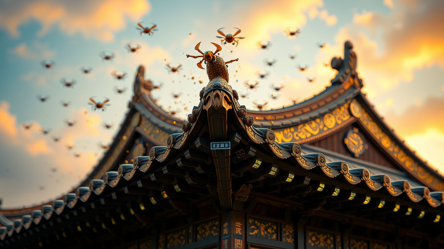作图提示词:Macro shot of the Hall of Supreme Harmony’s roof corner with a swarm of AI-guided nano-drones applying quantum-entangled gold leaf to dougong brackets, extreme close-up revealing fractal wood grain patterns interlaced with self-repairing nanocircuits, the 24k gold veneer embedded with photosensitive algae that glow softly at dusk, shot with tilt-shift lens at f/2.8 to emphasize the depth between ancient carpentry and molecular tech, warm bi-color lighting mixing 5600K sunlight with 3000K bioluminescence, color contrast between patinated bronze and vibrant aureolin