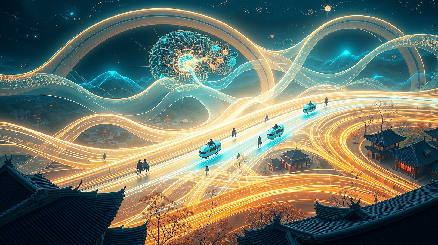 描述:高架桥不再是冰冷的混凝土,化作了流淌的光子河,琥珀与碧蓝的光流里,通勤舱如鱼群般穿梭。舱外,无数思维泡泡在半空漂浮——那是人们未说出口的想法,碰撞时便炸开细碎的光,像夜空中绽放的星火。远处的传统歇山顶在光河里投下温柔的剪影,光流的簌簌声与思维碰撞的脆响交织,整座城市的灵感在这光之河道上涌动,织成一张充满活力的创意之网。