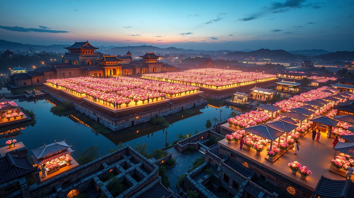 作图提示词:An aerial view of Sui-Tang Luoyang City ruins at twilight, where a luminous ‘Star Track Flower Market’ floats gently on atmospheric platforms, composed of thousands of glowing peonies in ceramic smart pots. Vendors in traditional Hanfu with illuminated embroidery glide between stalls, their movements triggering delicate light trails. Shot with a drone at golden hour, using a 24mm wide-angle lens to capture both the floating market and ancient ruins below, with a color palette of warm golds and deep purples contrasting against the cool blue twilight sky.