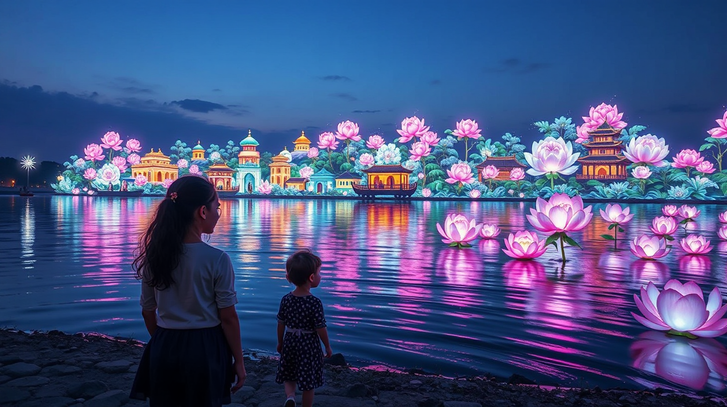 作图提示词:A riverside scene at dusk where the Luo River’s programmable water matrix displays holographic caravans of the Silk Road, their reflections shimmering on the water’s surface. As children approach, motion sensors trigger water projections that respond to their movements, creating ephemeral peony shapes that glow with bioluminescent hues. Shot with a 50mm lens at f/4 to balance the children in the foreground with the river display, using long exposure (1/15s) to capture the water’s motion blur, with colors transitioning from deep blues to vibrant pinks.