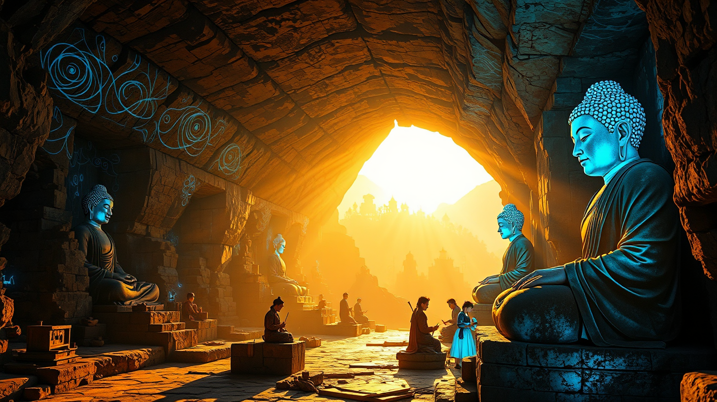 作图提示词:A breathtaking dawn at Longmen Grottoes, ancient Buddha statues illuminated by intricate quantum light patterns that shift like flowing silk, with holographic projections of historical artisans working alongside their stone carvings. The morning light casts golden rays through the grottoes, creating dramatic chiaroscuro effects on the weathered stone surfaces. Shot with a 35mm lens at f/2.8 to capture both the grand scale and intricate details, using a warm color palette with vibrant blue accents from the holograms.