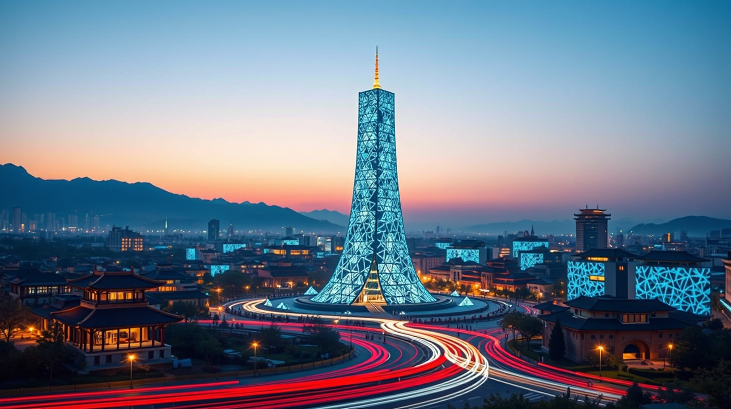 作图提示词:During blue hour, the carbon-fiber ‘Omni-Historic Projection Spire’ (45m tall, Han Dynasty-inspired lattice structure) emerges from the Heaven-Mingtang archaeological site. Smart facades across Luoyang activate fractal illumination patterns synchronized to Tang Dynasty music. Captured with 24mm tilt-shift lens at 1/60s exposure, showing light trails from ground-level perspective. Color grading emphasizes the contrast between warm 3000K architectural lighting and cool 6500K data streams against twilight sky.