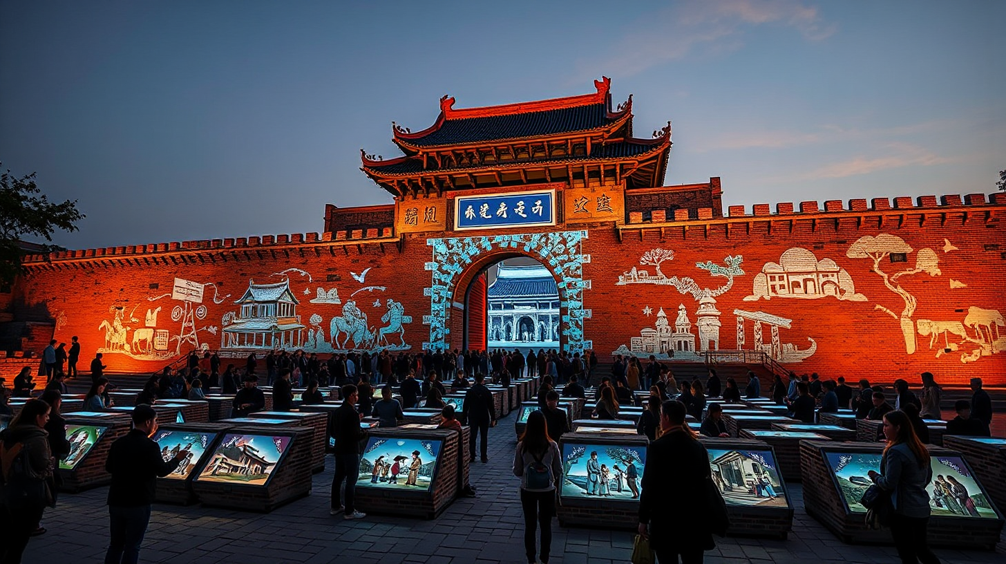 作图提示词:A twilight ceremony at Yingtian Gate ruins where touch-sensitive panels embedded in reconstructed bricks activate holographic displays of historical scenes. Visitors’ interactions create cascading light patterns that flow across the ancient structure, culminating in a central projection of Luoyang’s architectural evolution. Shot with a 28-75mm zoom lens at f/5.6 to capture both the grand architecture and intimate interactions, using a mix of warm artificial lighting on the bricks and cool holographic blues, with careful attention to the golden ratio in composition.
