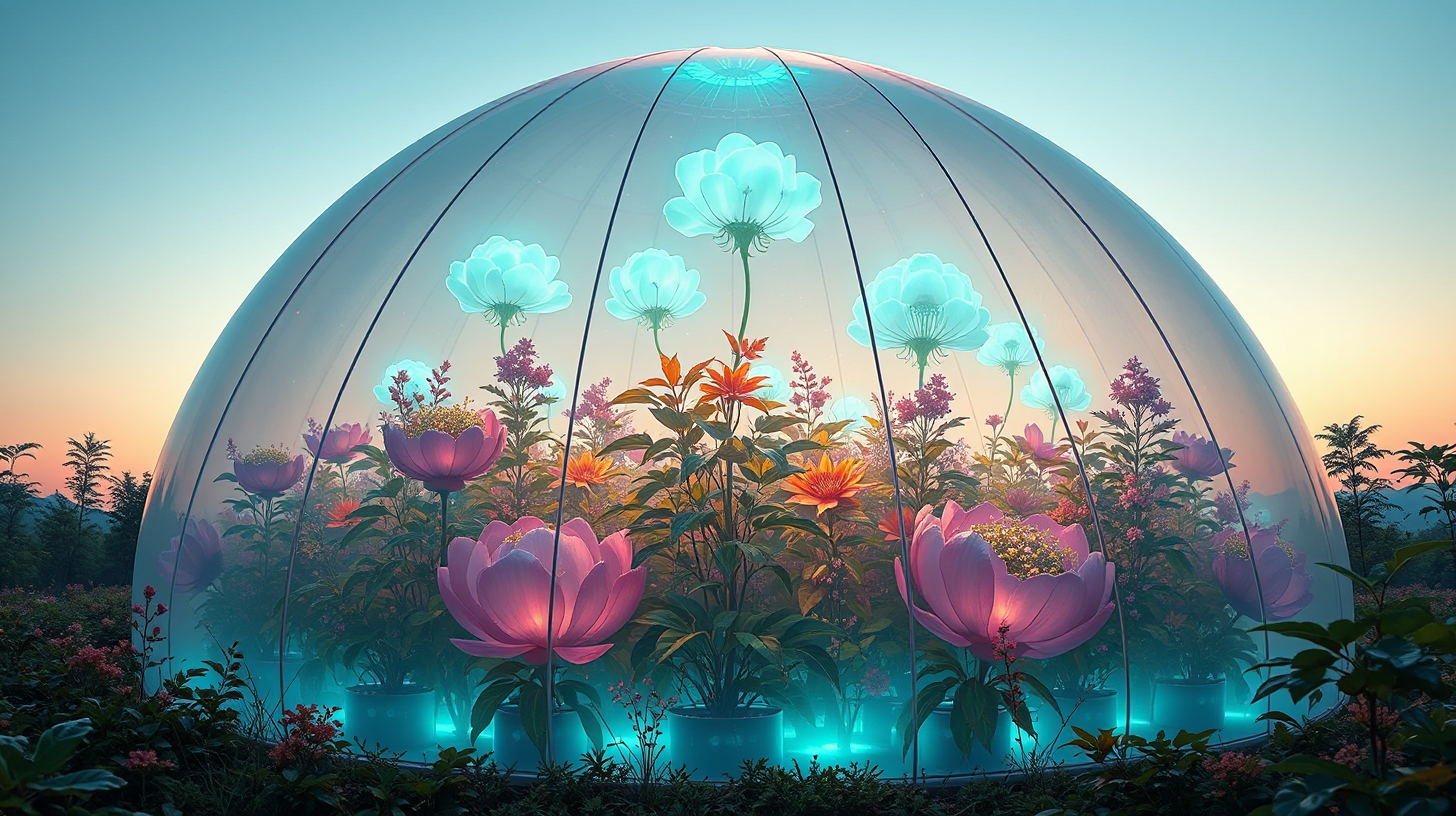 作图提示词:A translucent biopolymer dome shaped like a peony blossom (circa 2145 AD), housing endangered species in quantum-aeroponic cultivation modules. Holographic ‘phytomemory clusters’ float above each plant, displaying their evolutionary history in soft bioluminescence. Warm spectrum growth LEDs interact with cool-toned holograms, creating chromatic harmony. Shot with a 16mm wide-angle from ground level to emphasize the dome’s 30m height.