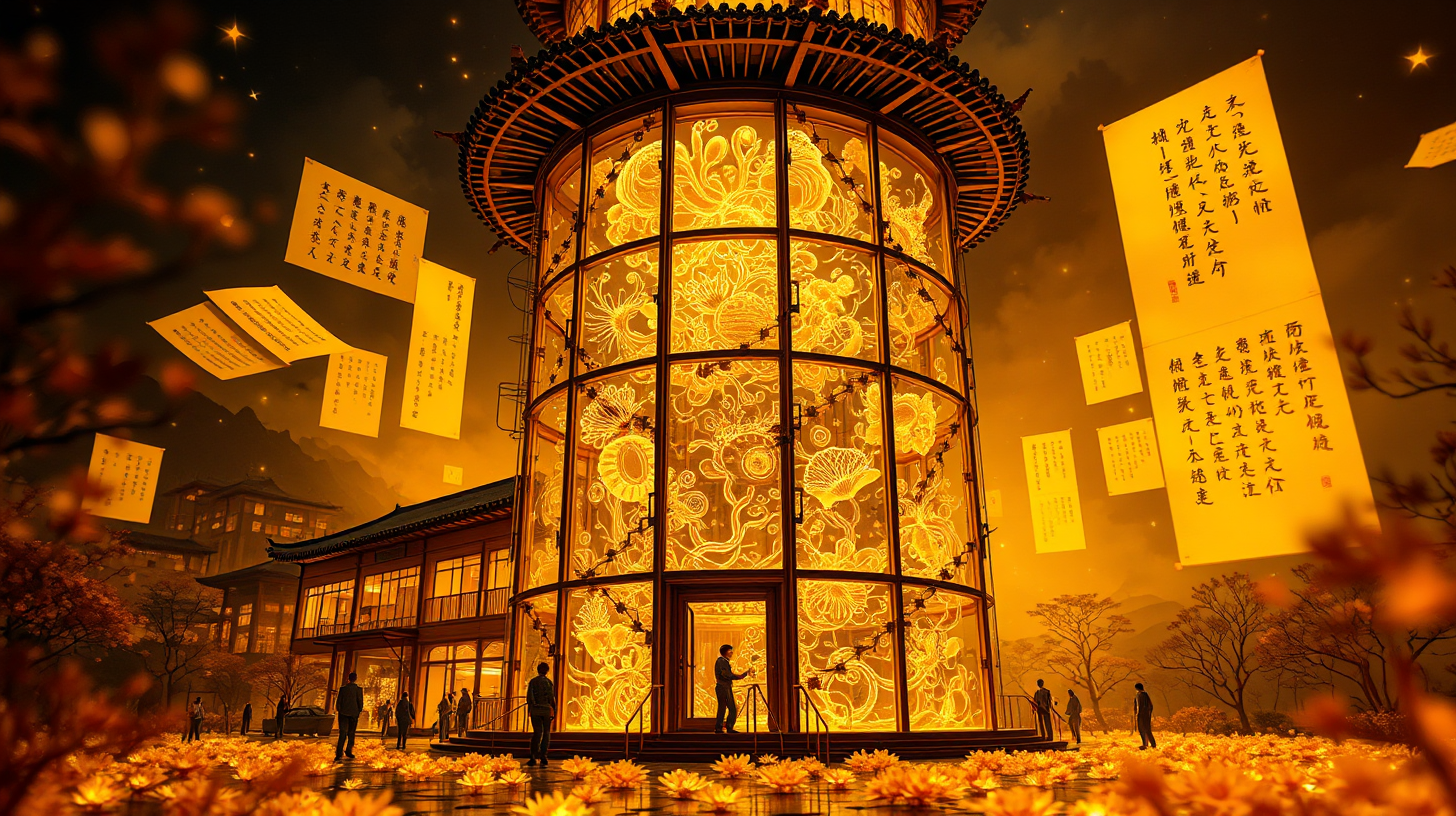 作图提示词:Medium close-up shot of Guyue Longshan’s bioluminescent fermentation tower, featuring transparent bioreactor chambers that reveal intelligent microbial cultures creating pulsating light patterns synchronized to an ancient Chinese symphony. The architecture merges Song Dynasty brewery design with contemporary biotech elements, glowing with amber-hued atmospheric lighting that casts dynamic shadows through the intricate fermentation dance. Holographic projections of classical Chinese poetry float in the air, rendered in a warm golden palette with subtle chromatic aberration effects, using shallow depth of field to focus on the central microbial light performance.