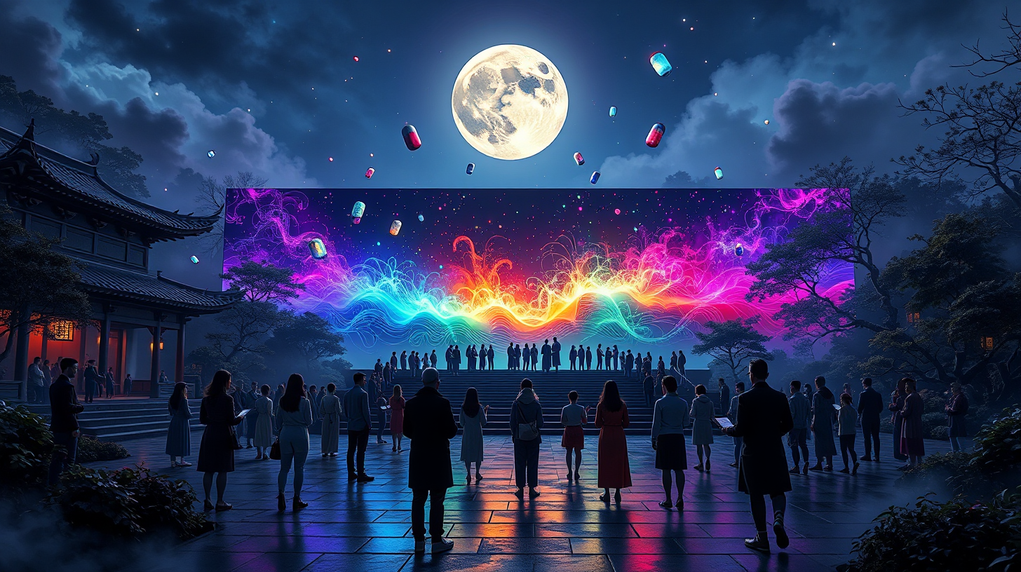 作图提示词:A moonlit scene in a futuristic Chinese garden featuring an advanced emotion spectrum wall displaying dynamic quantum light patterns visualizing real-time neural emotional data from a contemporary Kunqu opera performance, floating neuro-responsive memory capsules emitting adaptive bioluminescent glow in the air, diverse audience members interacting with the capsules through gesture interfaces, vibrant emotional color gradients shifting on the wall from deep cultural purple to technological electric blue, ultra-wide cinematic shot with balanced composition capturing both the traditional performance area and the interactive wall, seamless fusion of authentic Ming dynasty garden architecture with photorealistic holographic technology, dramatic chiaroscuro lighting creating strong contrast between shadowed garden elements and glowing high-tech installations, with subtle atmospheric haze enhancing depth
