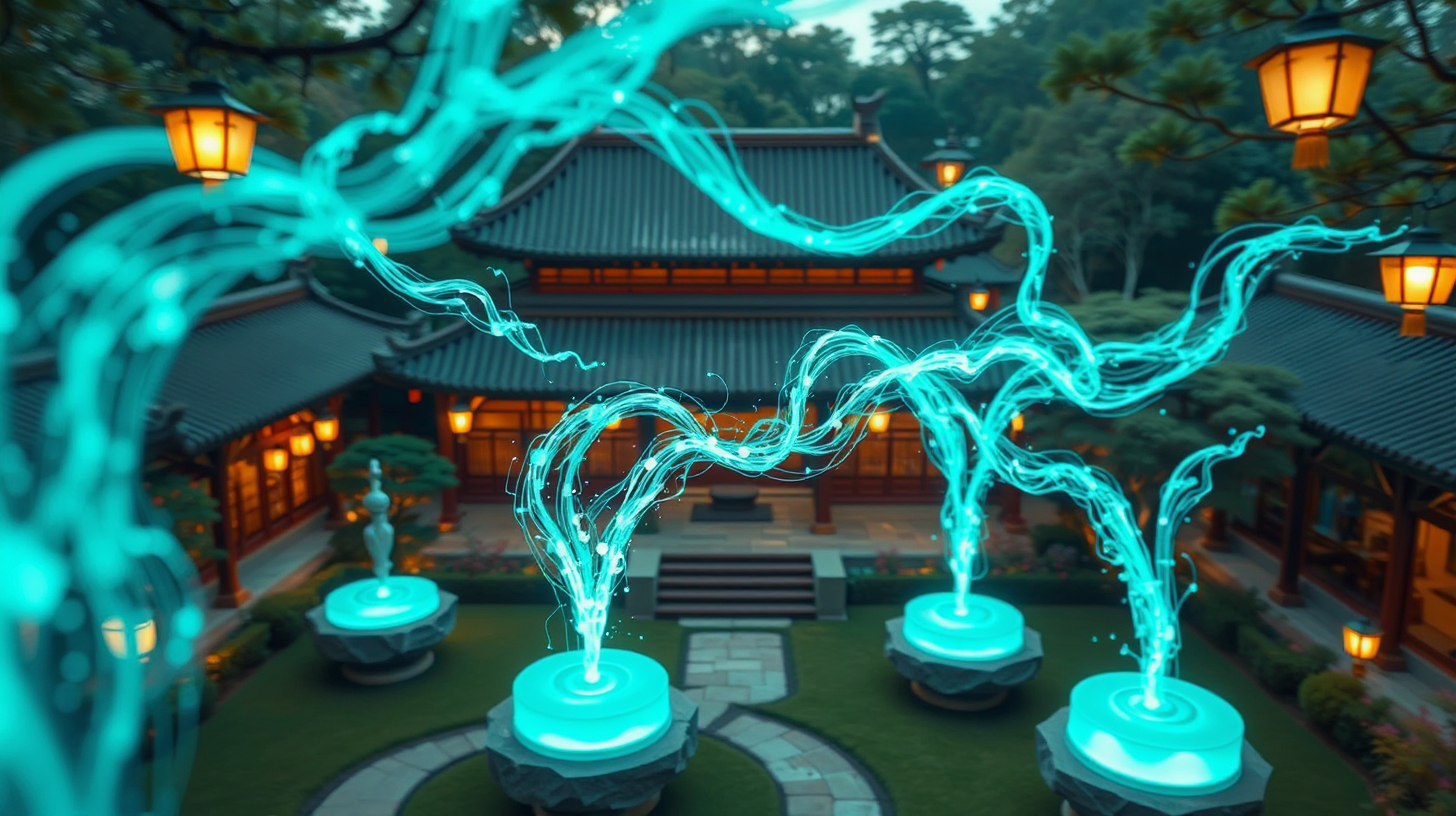 作图提示词:Overhead tracking shot of the quantum-enhanced Lishui Liushang installation, featuring levitating luminous inkstones where calligraphers’ neural-linked brushstrokes transform into flowing algorithmic poetry. Set within a classical Chinese garden, the hovering inkstones emit a soft cyan glow that contrasts with warm ambient lantern light, while digital ink trails form mid-air calligraphy that dissolves into data streams flowing toward a central repository. The composition balances traditional garden elements with futuristic components, using shallow depth of field to highlight the interaction between physical brushwork and digital manifestation, captured with motion blur to emphasize the dynamic transformation process.