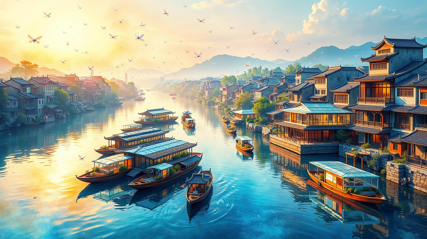 作图提示词:Aerial drone shot of Shaoxing’s ancient canals at dawn, where nanoscale water purifiers hover like bioluminescent fireflies, refracting morning light into prismatic spectrums across the water surface. Traditional wupeng boats have been converted into floating ecological classrooms with transparent smart-glass roofs, gently bobbing on the quantum-enhanced waterways. The scene captures a futuristic Chinese water town where advanced nanotechnology harmonizes with historic architecture, rendered in vibrant watercolor hues with soft volumetric morning light, mirror-like water reflections, and a balanced cinematic composition using the rule of thirds.