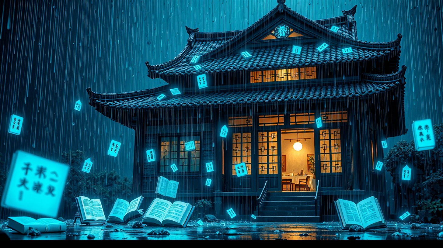 作图提示词:A futuristic Chinese traditional house with nanotech-enhanced black tiled roof embedded with quantum knowledge crystals, smart rain falling from AI-equipped eaves forming intelligent droplets containing digitized literary fragments from classical Chinese literature, each droplet bursting into interactive 3D holographic textbook projections upon hitting the ground, dramatic low-angle shot with cinematic depth of field capturing the precise moment of impact, neon-blue bioluminescent lighting with volumetric effects illuminating the raindrops against dark textured background, ultra-detailed cyberpunk aesthetic with authentic traditional Chinese architectural proportions and details, atmospheric cinematic lighting combining warm interior glow with cool exterior tech illumination