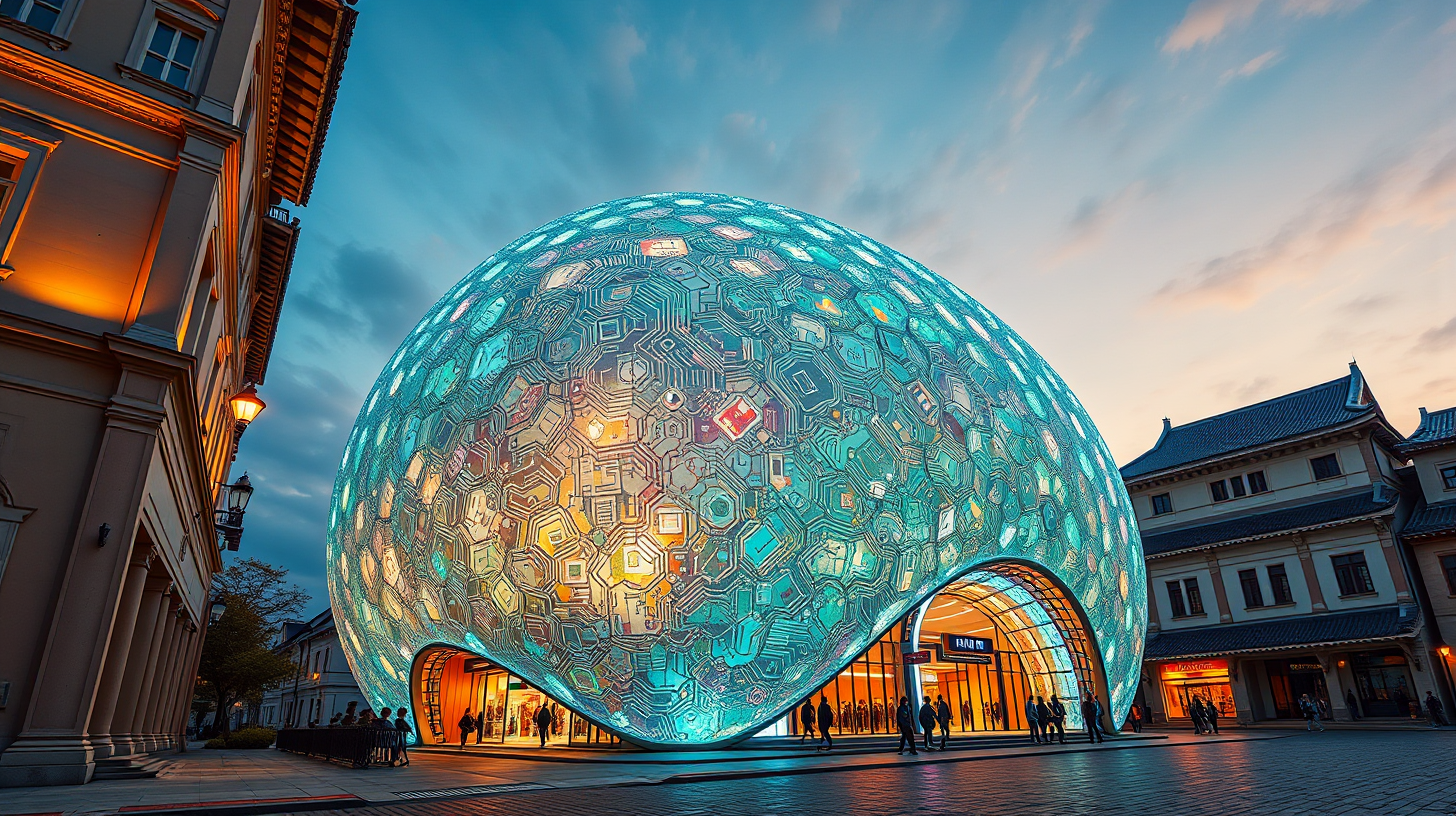 作图提示词:Low-angle side view of the cocoon-shaped quantum computing center at Lu Town’s historical site, featuring a building facade woven from responsive electronic silk that undulates like living tissue. The iridescent surface dynamically changes patterns, blending traditional Jiangnan textile motifs with quantum circuit board designs in real-time. Shot during twilight with a mix of warm tungsten lighting and cool neon accents, the composition uses leading lines from adjacent classical architecture to frame the futuristic structure, while the silk surface’s specular highlights create a moiré effect against the darkening sky.