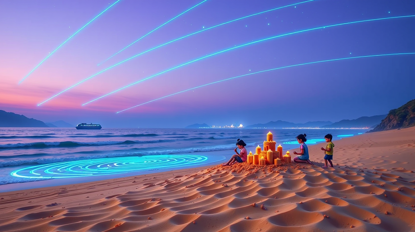 描述:双月湾的暮色像一块打翻了的调色盘,天空被染成了温柔的紫罗兰色。光子轨道车划破天际,留下一道道虹光轨迹,如同天空随手画下的五线谱。水下,智能珊瑚礁释放的声波化作一圈圈 aqua 色的光环,与海浪的节奏轻轻共舞。沙滩上,孩子们正用会唱歌的沙粒堆砌城堡,每添上一粒,沙堡便会发出一段清脆的旋律。潮汐拍岸时,光粒随着浪涛跳跃,奏响了一曲属于科技与童年的交响乐。
