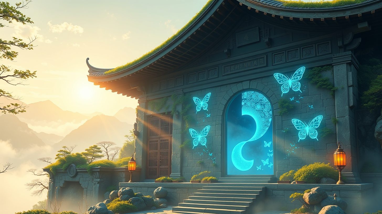 描述:罗浮山的青瓦飞檐在晨雾中若隐若现,古老的道观仿佛从时光深处走来。墙面上,量子苔藓正悄然绘就一幅流动的太极图,黑与白的纹路随山间气流缓缓变幻。悬浮的生态模拟器散发着柔和的光晕,轻轻唤醒了一群全息蝶群,它们扇动着半透明的翅膀,在道观与模拟器间翩翩起舞。一位道士与一位科学家并肩而立,目光交汇间,古老的智慧与未来的科技像是久别重逢的老友,在这片山林间达成了最美的平衡。