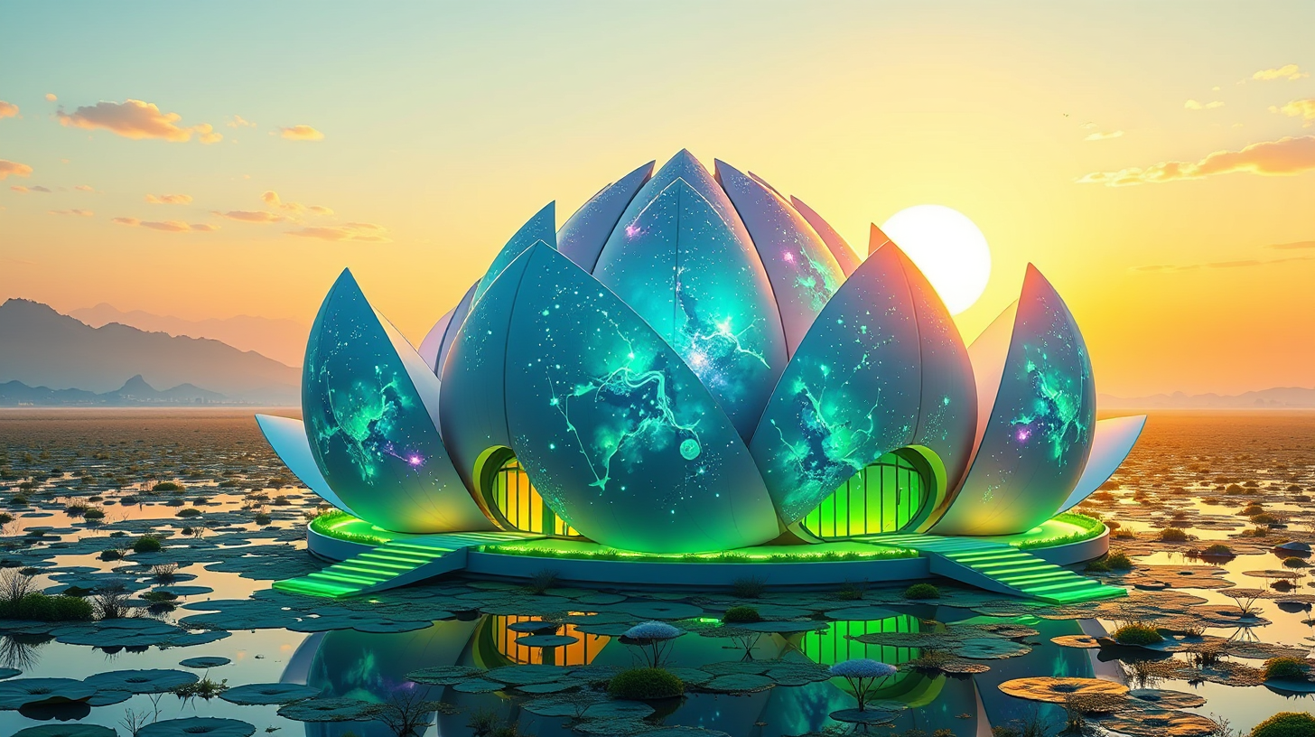 作图提示词:A futuristic modular laboratory in Tonghu Wetland, shaped like a blooming lotus with glowing green ecological barriers, under a golden sunset. Nebula projections flow across the building facades, creating a serene yet technologically advanced atmosphere. The composition features a side view, highlighting the dynamic interplay between the lotus-like structures and cosmic projections, with balanced natural lighting and vibrant colors.