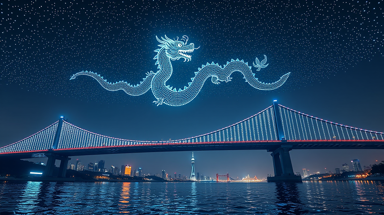 描述:惠州大桥的悬索在夜空中划出坚毅的线条,桥塔上的生物电收集装置闪烁着微光。千万个生物电光点从四面八方汇聚而来,在夜空中慢慢勾勒出一条巨大的东江龙形图腾,龙鳞在月光下泛着蓝白色的光泽,仿佛随时会腾云驾雾。突然,全城的清洁机器人方阵切换了模式,它们在空中编织出一张流动的金黄色光网,光网中渐渐浮现出跨越古今的城市精神宣言。江面上,龙影与光网的倒影交相辉映,整座城市都沉浸在这场科技与文化的盛大庆典中。