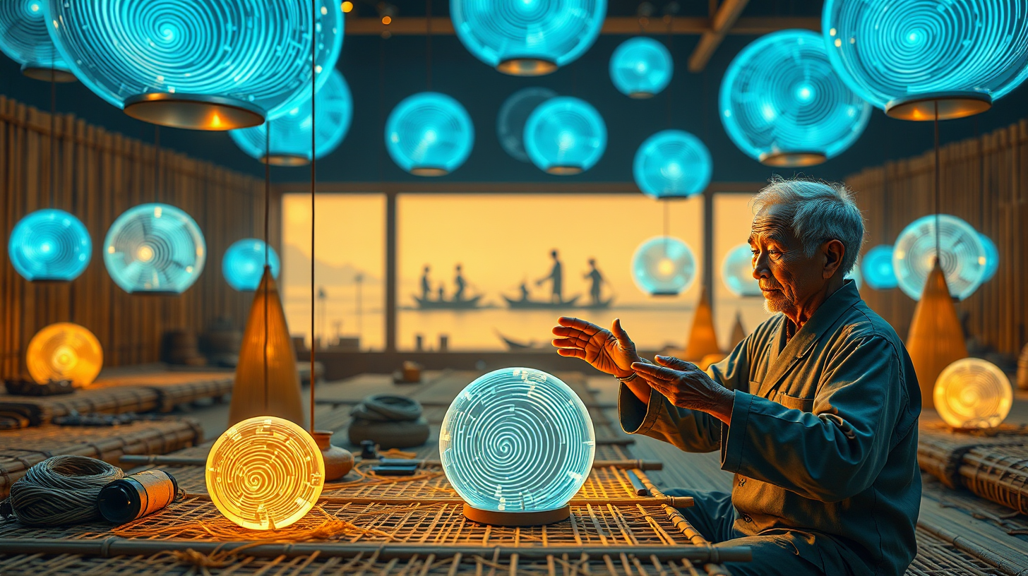 作图提示词:The Huidong Fishing Memory Archive in 2182, where hemispherical quantum capsules store sonic memories as swirling patterns of light, each pulse representing generations of maritime heritage. Nanobot projectors generate holographic scenes of fishing history that interact with physical artifacts suspended in zero-g fields. Elderly fishermen demonstrate traditional net-weaving techniques through neural interfaces that translate muscle memory into instructional light patterns. Shot with a 50mm macro lens at f/1.4 to create intimate focus on the craftsmen’s hands while allowing the holograms to softly blur into the background. Warm ambient lighting from bioluminescent panels casts a golden glow on weathered faces, contrasting with the cool blue tones of quantum storage systems. The composition balances rustic textures of woven bamboo with sleek futurism of floating displays, using leading lines to guide viewers through this emotionally evocative fusion of cultural preservation and technological enhancement.