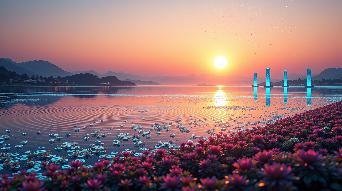 作图提示词:A breathtaking sunrise over Huizhou West Lake in 2180, where quantum ripples create mesmerizing fractal patterns on the water’s surface, while self-replicating nanotech algae form glowing bioluminescent networks. Neural interface pillars stand gracefully along the shoreline, emitting a soft cerulean glow that harmonizes with the golden dawn light. Holographic Tang dynasty poetry floats delicately above the lake, their characters dissolving into stardust. Captured with a 120mm tilt-shift lens at f/2.8, shallow depth of field emphasizes the foreground algae while maintaining crisp details of the quantum effects. Cinematic lighting with vibrant magenta and gold hues reflects off the nano-enhanced water surface, creating a serene yet technologically advanced atmosphere. Hyper-realistic details showcase the perfect symbiosis of cutting-edge technology and traditional Chinese landscape aesthetics.