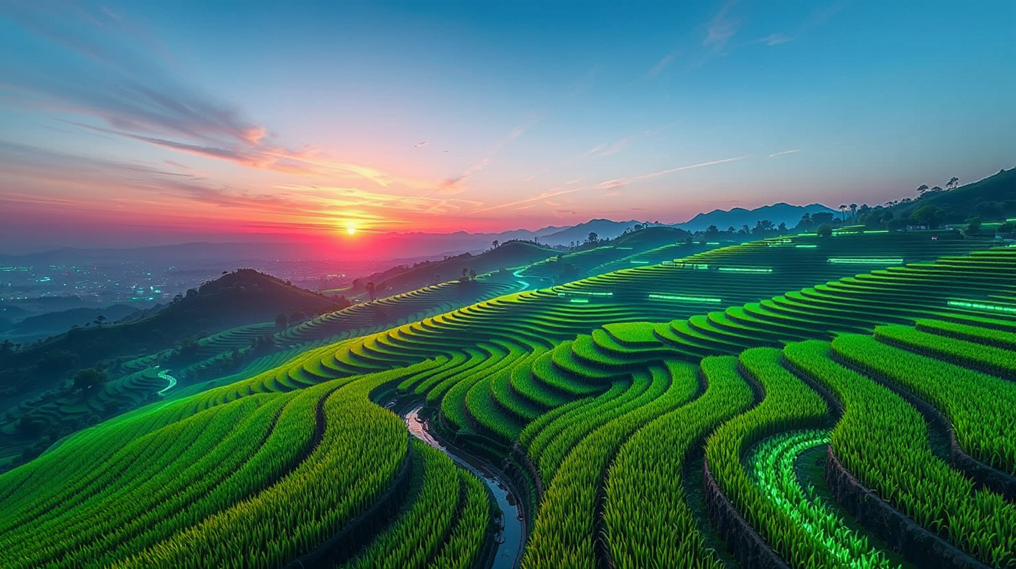 作图提示词:A breathtaking aerial view of quantum terraced fields in Guiyang at dawn, layered rice paddies glowing with data streams, luminous rice ears gradually lighting up under sunlight, creating a dynamic spectrum painting, futuristic agriculture blending with nature, vibrant colors of sunrise reflecting on the high-tech fields, ultra-detailed, cinematic lighting, awe-inspiring technological harmony with landscape. The scene captures the essence of 22nd-century sustainable farming with bioluminescent crops and quantum-enhanced growth systems.