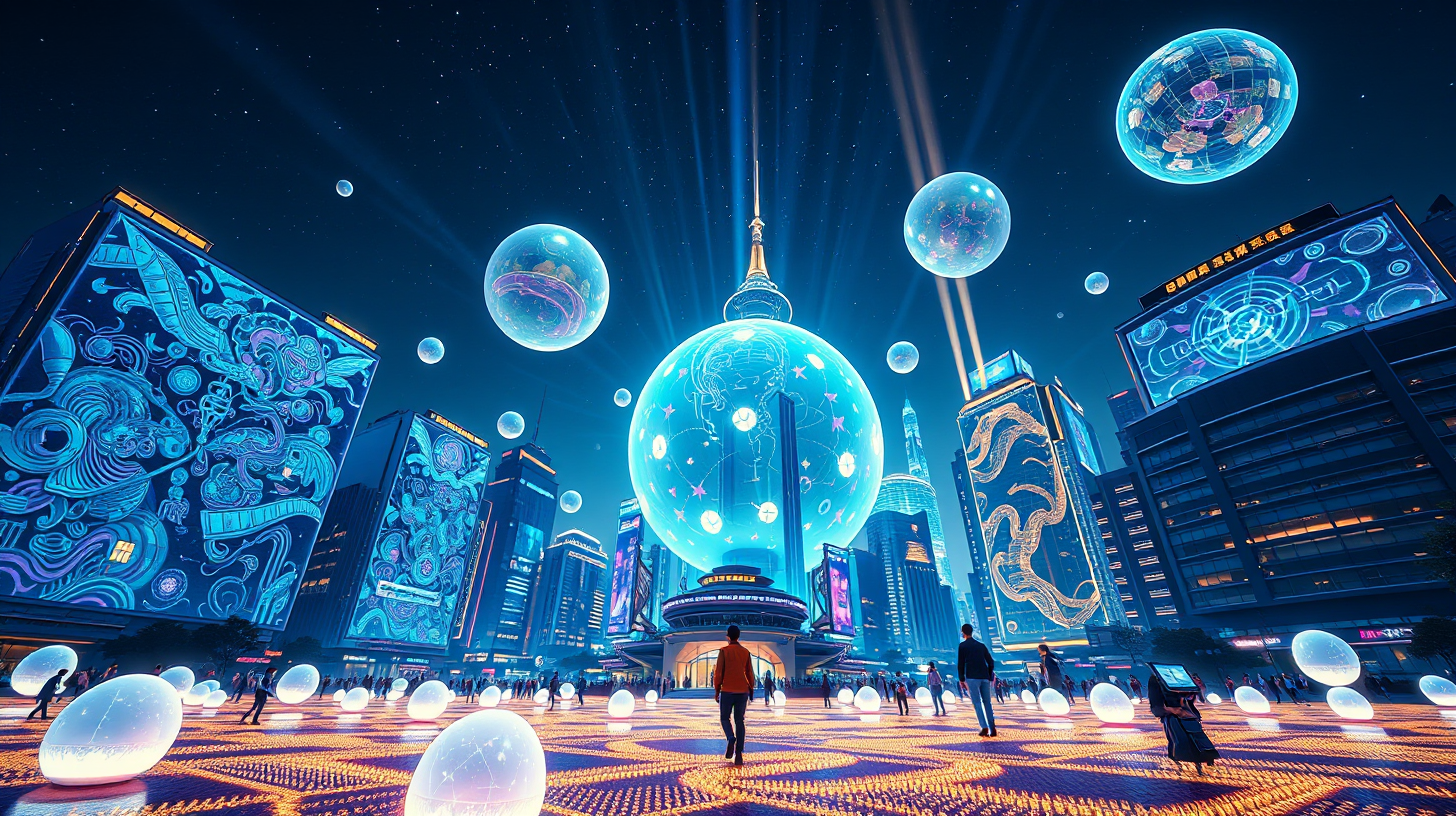作图提示词:A futuristic cityscape at night in Guiyang, China, with dynamic semantic reliefs on building facades changing in real-time with collective consciousness, floating resonance field spheres emitting soft bioluminescent light that intertwines with ground-level holographic light patterns, ultra-wide shot from a low angle capturing the entire luminous spectacle under a starry sky, vibrant neon colors with deep blue and purple hues contrasted with warm golden accents, energetic and awe-inspiring mood, cinematic lighting with glowing elements against the dark sky, volumetric light rays piercing through the scene, high dynamic range with rich shadow details.