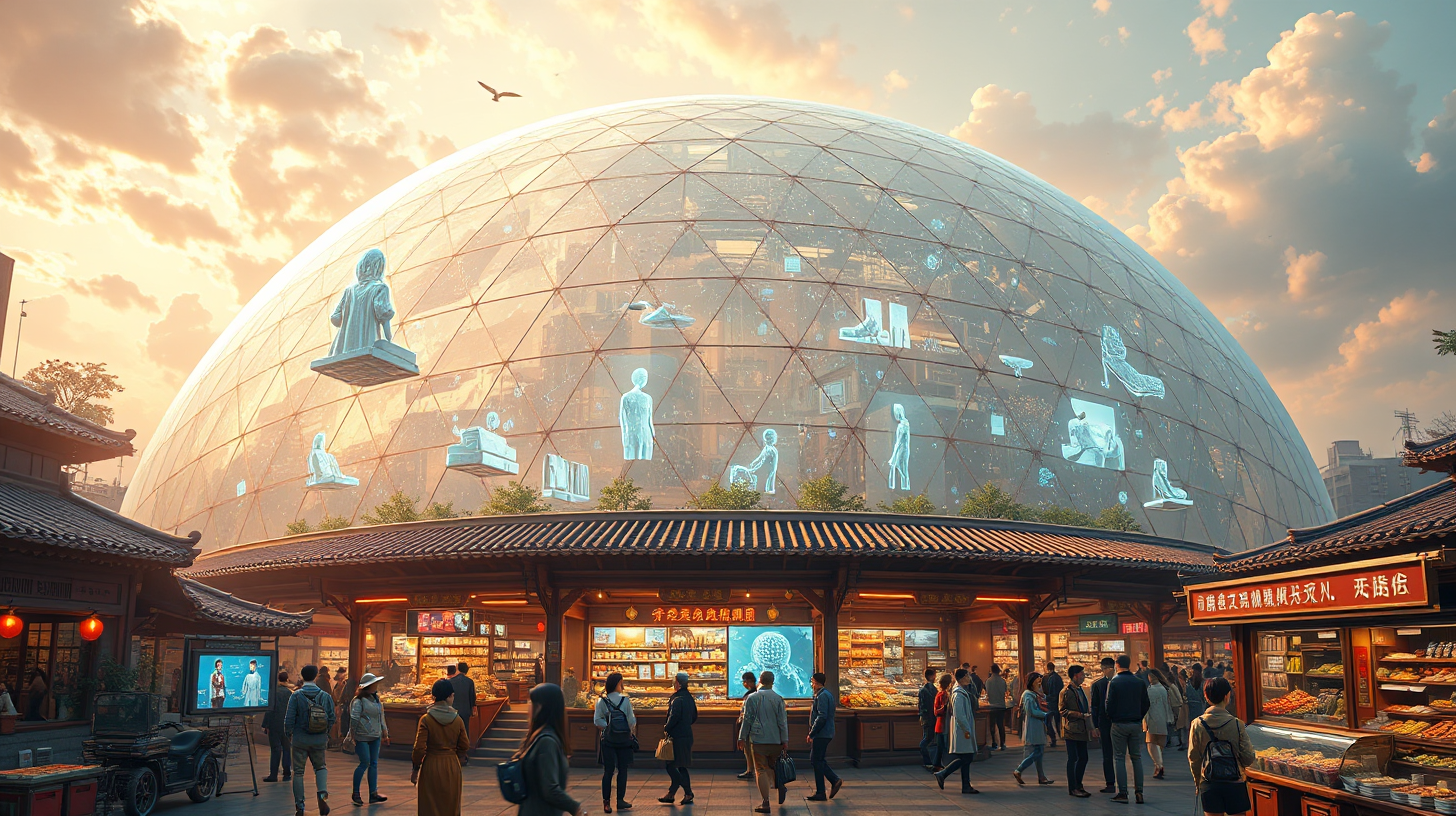 描述:纳米材料筑成的生态穹顶如巨伞般笼罩着贵阳市中心的市集,晨光透过智能调节的透光层,在青砖地面投下斑驳光影。全息投影的商品在空中缓缓旋转,老人坐在木凳上捻着蜡线,蜡染布上的蝴蝶在她指尖渐显,身旁的机器人正将图案转化为数据流存入数据库。叫卖声与全息提示音交织,传统的温度与科技的便捷在此刻相拥。