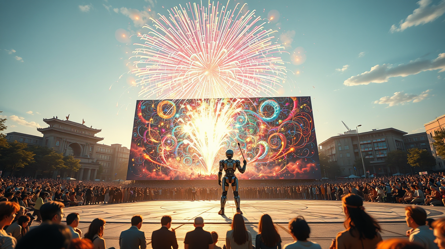 作图提示词:A neural drawing robot performing in a Guiyang square, converting audience emotions into vibrant colors and lines on a large canvas, the artwork suddenly blooming into a magnificent firework display, crowd watching in awe, warm evening lighting casting long shadows, magical moment where technology meets art, highly expressive and emotional scene, cinematic wide shot with low angle perspective. The robot uses advanced EEG wave interpretation algorithms developed in 2135 for real-time emotional translation.