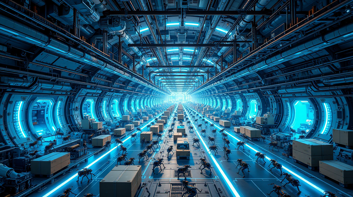 作图提示词:An intricate underground quantum logistics network in Guiyang, countless robotic workers moving like ants through a labyrinth of tunnels, transporting and assembling goods with precision, glowing navigation lines on the floor and ceiling, cool blue lighting illuminating the high-tech subterranean world, highly organized mechanical ballet, futuristic industrial aesthetic with incredible detail. The system utilizes quantum entanglement for instant inventory tracking, representing 2130s logistics technology.