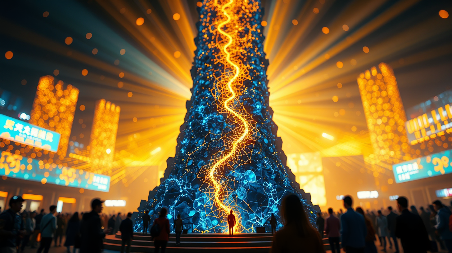 作图提示词:A monumental bioluminescent quantum totem in the central plaza of futuristic Guiyang, with a newborn baby’s genetic sequence being projected in real-time onto its nano-crystalline surface forming intricate glowing fractal patterns, extreme close-up view of the totem’s new growth lines emerging with pulsating soft golden light that reacts to nearby brainwave activity, warm and sacred atmosphere with ceremonial onlookers in the bokeh background, cinematic lighting with dramatic volumetric rays illuminating floating nanotech particles, vibrant colors transitioning from deep electric blue to radiant golden hues, macro details showing biotech circuitry merging with organic patterns, symbolic representation of life and future, shallow depth of field focusing on the newest growth line with light diffraction effects.