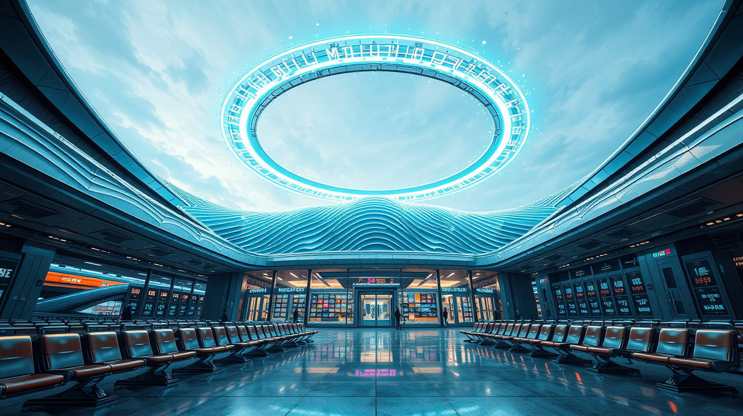 作图提示词:The futuristic Hongqiao Hub transportation center, where maglev trains trigger rippling light waves across the building facade. Neuro-sensitive waiting chairs emit personalized white noise, while cultural memory capsules exchange between automated luggage lockers, forming a rotating data halo in mid-air. Ultra HD, sci-fi architecture, cool metallic tones with vibrant data stream accents, dramatic perspective looking up at the glowing data ring, highly detailed futuristic transportation hub environment.