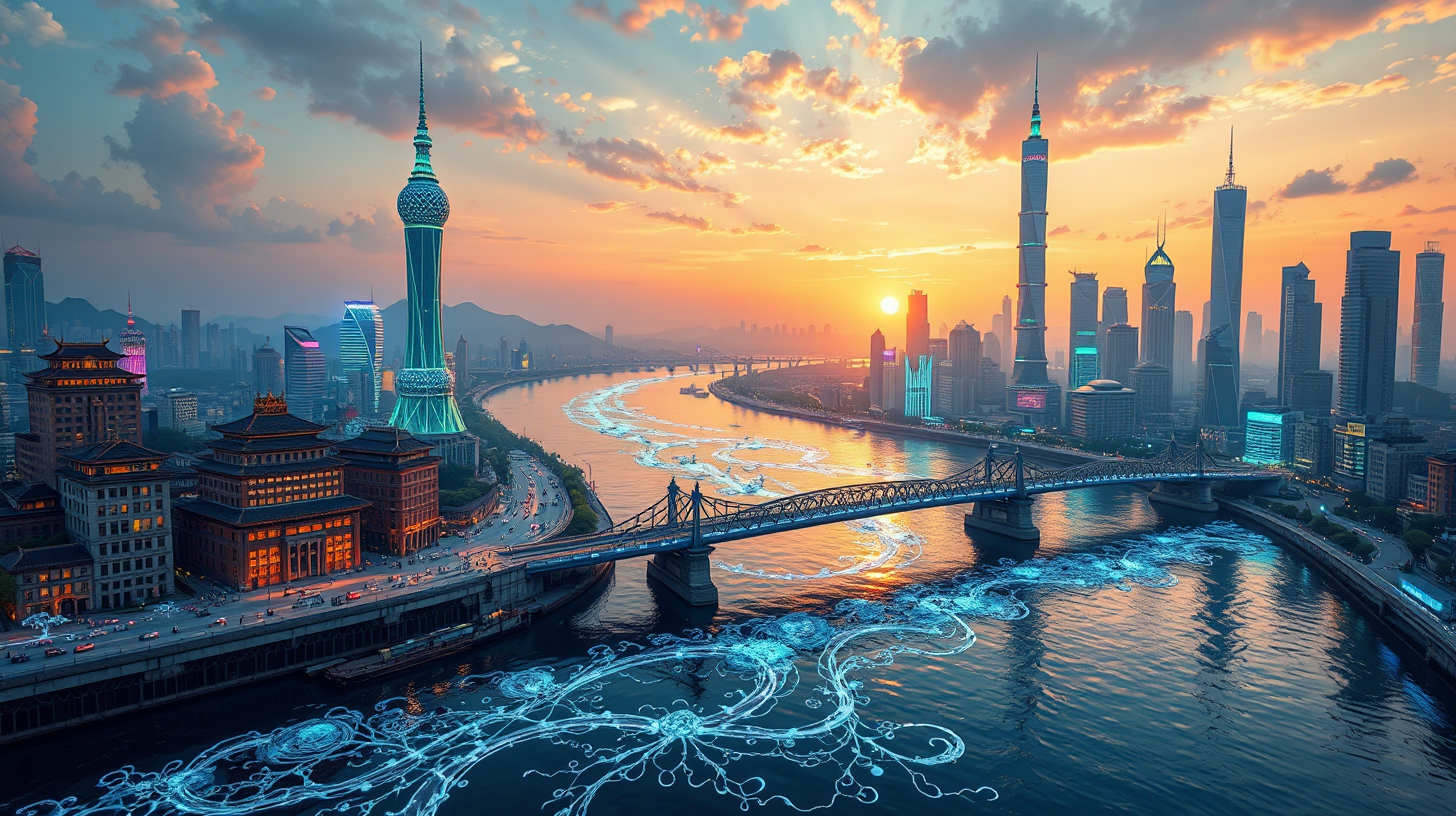 描述:晨曦刺破云层,黄浦江苏醒如液态星辰。纳米机器人织就的光带在江面翻涌,两岸建筑的全息浮雕正上演千年变奏——渔村炊烟漫过钟楼尖顶,转瞬凝成陆家嘴量子塔的轮廓。外白渡桥的钢铁骨架间,生物荧光藤蔓顺着锈迹攀爬,与对岸的科技森林碰出时空的火花,江水拍岸声里,藏着老码头与新数据的二重唱。