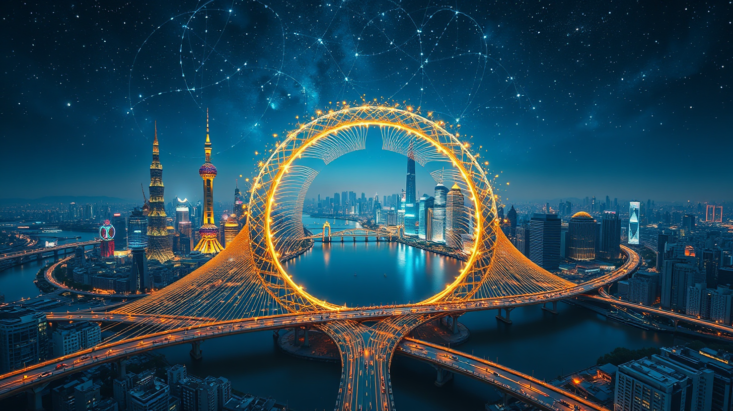 作图提示词:A breathtaking midnight view of Shanghai’s skyline, where the buildings on both sides of the Huangpu River form a giant neural feedback network. The pedestrian bridges between the Bund and Pudong connect to form a complete luminous ring, emitting harmonious frequencies of human civilization into the cosmos. Citizens upload their daily memories through wearable devices, creating streams of golden data flowing toward the central ring. An ultra-wide aerial shot captures the magnificent spectacle, with the city’s glowing neural network contrasting against the deep blue cosmic background, conveying a sense of sacred connection between humanity and the universe.