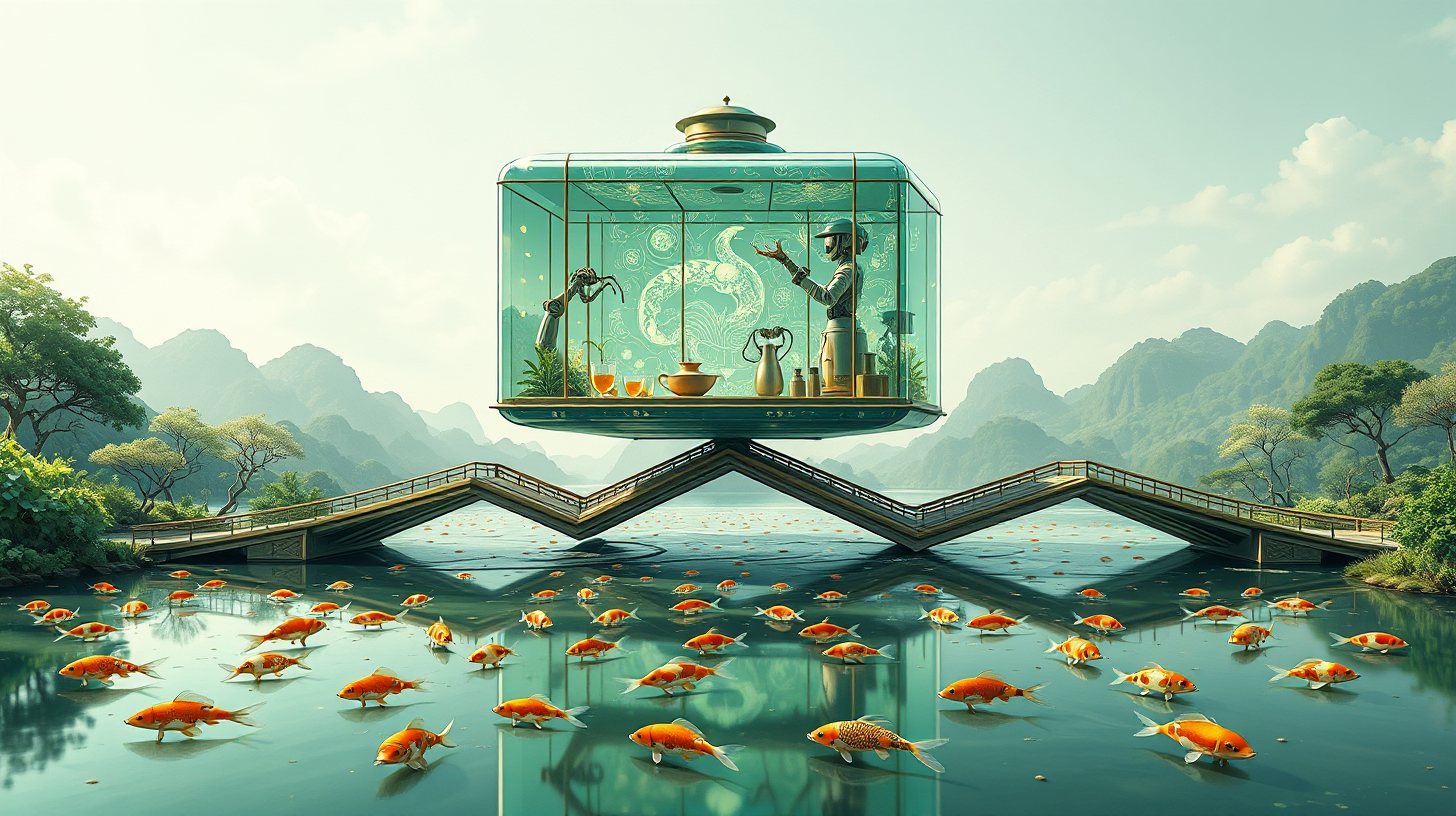 作图提示词:A futuristic transparent tea room floating mid-air, where robotic arms prepare Biluochun tea following intricate fractal trajectories. The aroma molecules transform into mesmerizing 3D holograms surrounding the tea room. Below the zigzag bridge, schools of nano-robot koi fish swim in precise patterns that display real-time water quality data on the lake surface. Ultra-realistic, zen-tech aesthetic, soft diffused lighting, elegant green and gold color palette, intricate details of tea ceremony machinery and holographic projections.