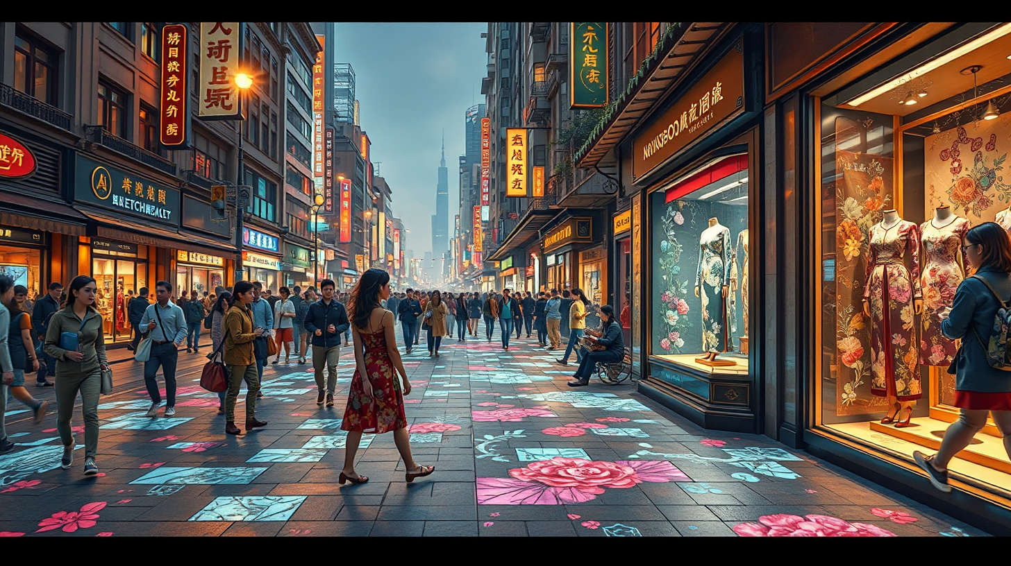 作图提示词:Nanjing Road Pedestrian Street with programmable smart pavement that activates vintage Shanghai projections underfoot. An AI cheongsam tailor shop window displays dresses with dynamic Su embroidery patterns that evolve based on emotional memories. Ultra HD, neo-futurism style, vibrant mix of historical and cyber elements, warm street lighting with neon accents, highly detailed crowd simulation and interactive projections.