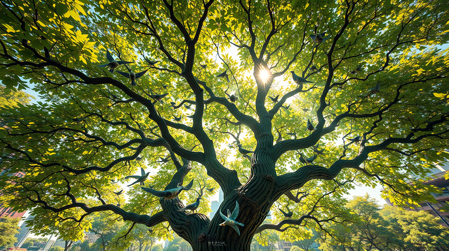 作图提示词:A futuristic scene in Shanghai’s French Concession, where century-old plane trees have photosynthetic power-generating membranes embedded under their bark. Among the tree canopies float quantum holographic workshops of makers. Mechanical bird flocks created by old craftsmen synchronize their formations on the branches. The sunlight filters through the leaves, casting dynamic shadows as the birds shift patterns. A low-angle view captures the harmonious blend of nature and quantum technology, with vibrant green and gold lighting creating a sense of wonder and innovation.