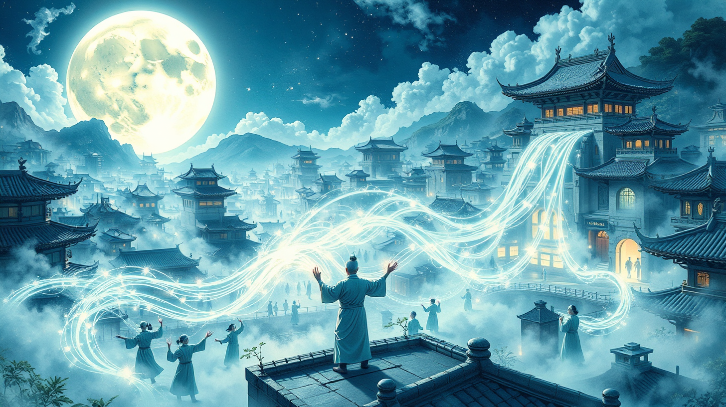 作图提示词:A futuristic Chinese city at night, bathed in the glow of a full moon, with ancient architecture releasing healing mist infused with herbal essences. Elderly figures practicing tai chi in slow, graceful movements, their motions generating luminous trails of immunity-enhancing light patterns. The mist flows like translucent silk through the streets, illuminated by the moonlight and the glowing trails. Traditional Chinese rooftops blend with futuristic structures, all shrouded in the mystical healing atmosphere. Ethereal blue and silver color palette with soft glowing highlights.