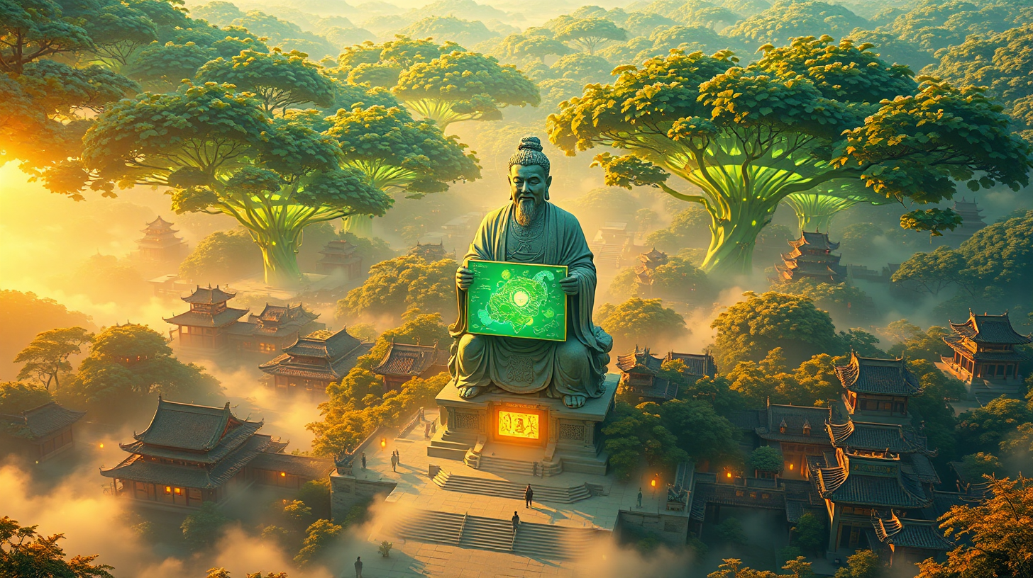 作图提示词:A breathtaking aerial view of Bozhou ancient city at dawn, featuring a vast photosynthetic canopy of intelligent medicinal herbs emitting healing bio-fluorescent light. The ancient statue of Hua Tuo holds a holographic pharmacopoeia projecting a dynamic 3D atlas of ‘Compendium of Materia Medica’. The scene is bathed in golden morning light with soft glowing hues, creating a serene and sacred atmosphere. Ultra-detailed futuristic Chinese architecture blends intricate traditional motifs with cinematic lighting, volumetric rays, and vibrant emerald green and golden yellow colors, enhanced by ethereal mist effects. Shot with a wide-angle lens to capture the grandeur, shallow depth of field to focus on the holographic projections, and warm color grading to emphasize the dawn light.