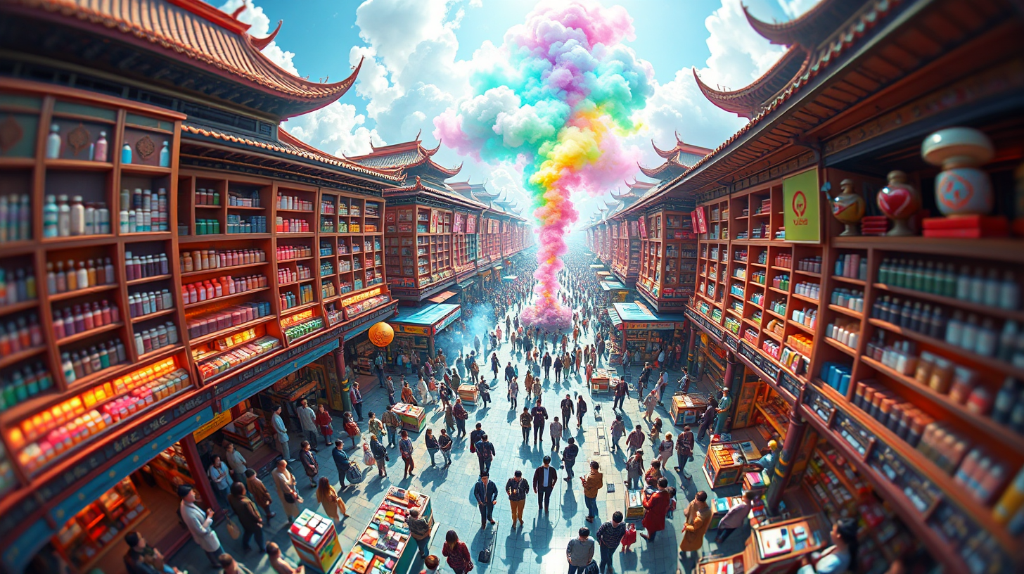 作图提示词:A breathtaking bird’s-eye view of the centennial medicine fair transformed into a three-dimensional holographic marketplace. Intelligent medicine cabinets reorganize in mid-air like building blocks, while pharmacists from around the world negotiate through mind projections. Their transaction data transforms into colorful medicinal mist that rises to form ozone-protecting medical clouds. The scene is a vibrant mix of traditional Chinese market elements and futuristic technology, with dynamic lighting and rich rainbow spectrum colors. Ultra-detailed crowd simulation includes holographic effects, captured with a cinematic wide-angle composition. Shot with a fisheye lens for dramatic perspective, deep depth of field to maintain clarity throughout, and vibrant color grading to highlight the holographic elements.