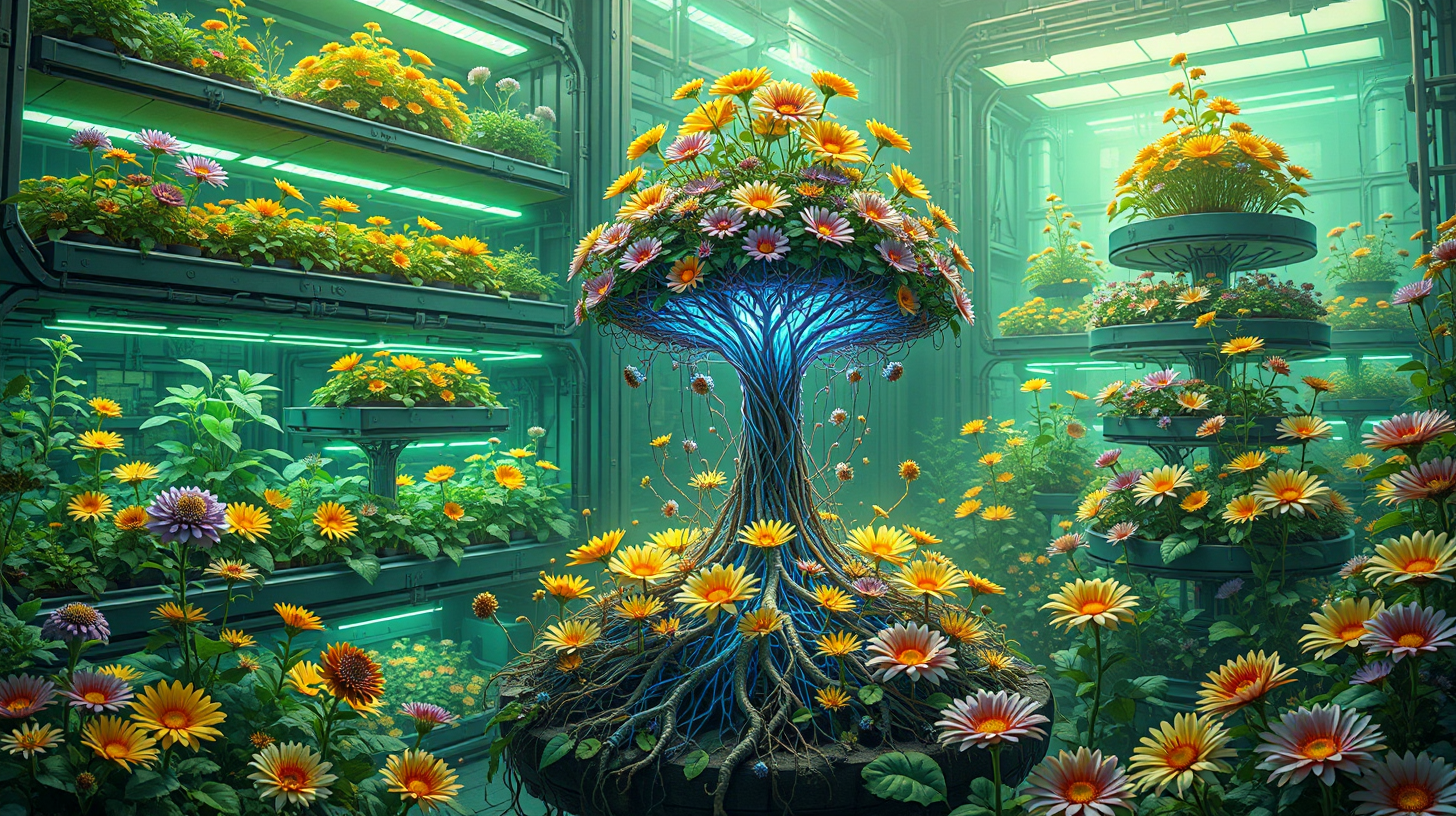 作图提示词:A high-tech vertical farm with tiered cultivation platforms, featuring miraculous super herbs glowing with bioluminescence. Golden huangjing roots emit melodic vibrations, while intelligent chrysanthemums shift colors from purple to gold in response to invisible stimuli. A central rehmannia mother plant spreads its neural network-like root system pulsating with soft blue light. The scene is filled with a mystical greenish glow from growth lamps, highlighting the perfect fusion of ancient herbal wisdom and cutting-edge biotechnology. Highly detailed textures of organic-mechanical hybrid plants.