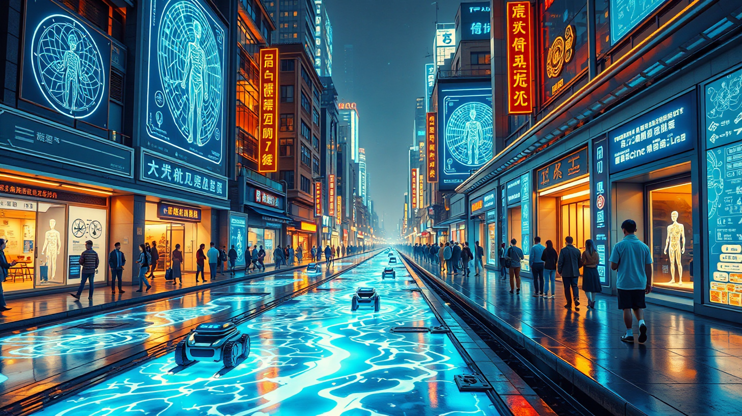 作图提示词:A futuristic city main road transformed into a glowing riverbed of Chinese medicine essences, with nano-scale dispensing robots cruising along the luminous flow. The building facades on both sides project human meridian diagrams, where citizens place their palms to receive customized health diagnostics. The scene is illuminated by the soft blue glow of the medicine river, contrasted with warm lights from the buildings. Highly detailed cyberpunk-style Chinese architecture incorporates traditional medical motifs, cinematic neon lighting, vibrant sapphire blue and amber colors, and reflective surfaces with holographic elements. Captured with a medium telephoto lens for compression, deep depth of field to keep all elements sharp, and cool-toned color grading to enhance the futuristic vibe.