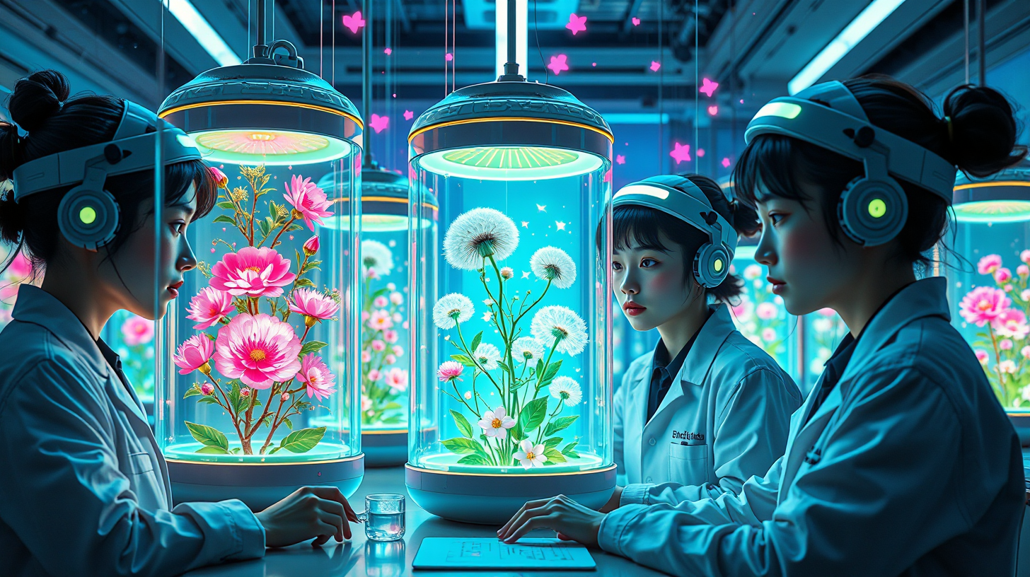 作图提示词:A close-up view of young pharmacists wearing neural interface headbands, working in front of floating quantum cultivation pods. Inside the pods are glowing ginseng that pulsates rhythmically, mechanical dandelions that automatically sort medicinal properties, and holographic peonies that simulate drug efficacy. The scene is illuminated by the soft bioluminescence from the pods, with data streams visible in the air. Ultra-detailed laboratory setting combines futuristic Chinese elements with cinematic sci-fi lighting, vibrant electric blue and neon pink colors, and holographic interface effects. Shot with a macro lens for intricate details, shallow depth of field to focus on the pods, and high-contrast lighting to emphasize the bioluminescence.