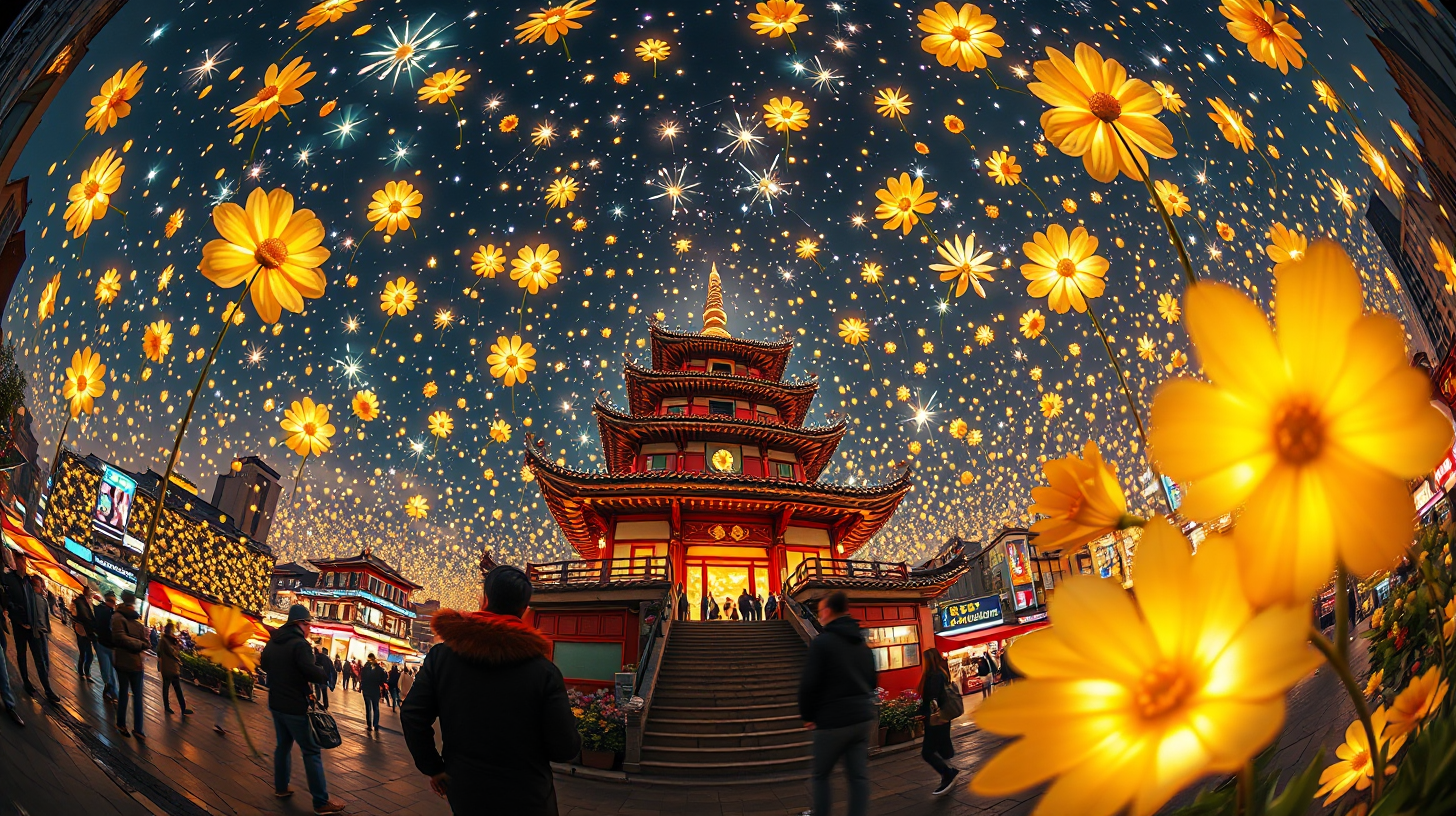 作图提示词:A fisheye lens view of New Year’s Eve sky filled with topological flower market constellations, where citizens’ thoughts materialize as glowing narcissus and kumquat formations. As the midnight bell rings from the Light Pagoda, all virtual flowers suddenly become physical, drifting down with bioluminescence to blanket the streets, immersing the city in a technological festival magic. Captured with a wide aperture to create starburst effects from the glowing flowers, using long exposure to trace their descent through the night sky.